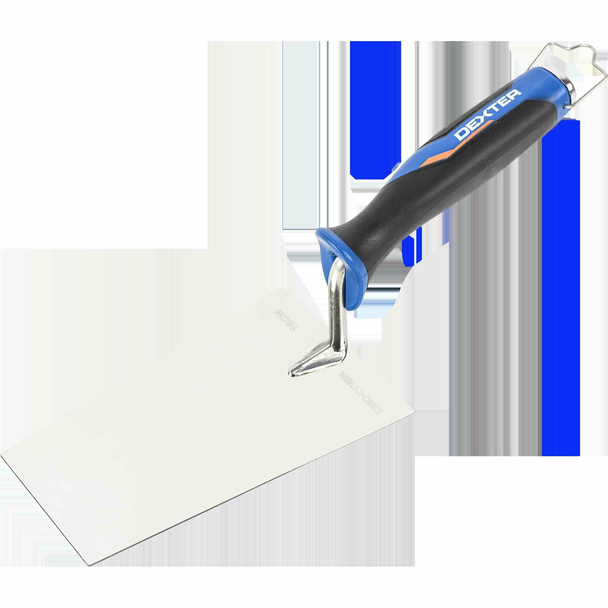 Кельма-трапеция Dexter — ручной инструмент, который можно использовать для нанесения различных видов штукатурок, шпатлевок и кладочных растворов, а также для удаления старой отделки при подготовке поверхностей к оштукатуриванию. Общая длина инструмента составляет 32,5 см, длина рабочей планки — 18 см, ширина — 107 мм. Основной материал — нержавеющая сталь.