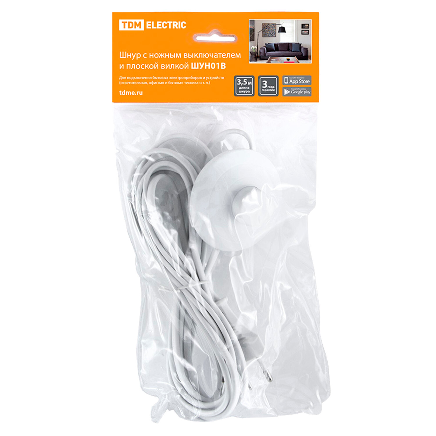 Шнур сетевой с ножным выключателем цвет белый 3.5 м TDM Electric (ШУН01В белый TDM)