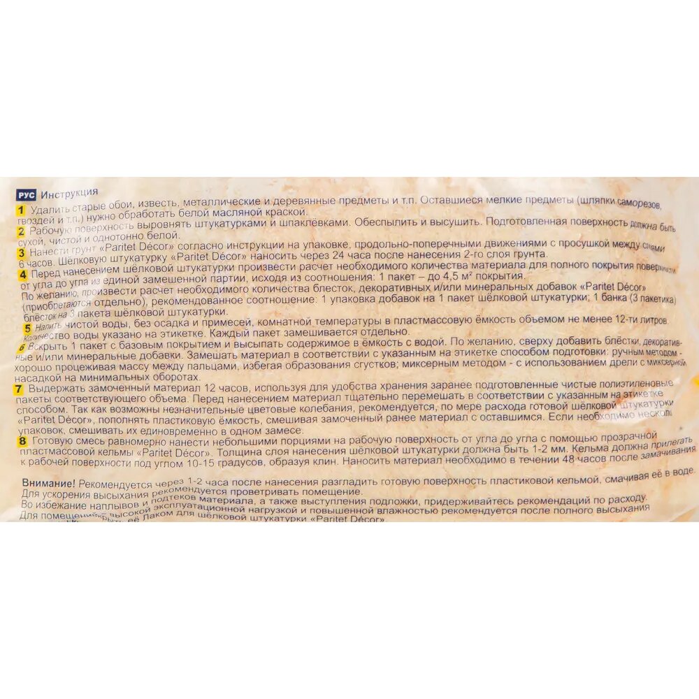 Жидкие обои в стиле «натуральный шарм» — это декоративный материал для стен, сочетающий свойства штукатурки и декоративной краски. Придают стенам особый шелковистый блеск. Универсальный состав предназначен для отделки жилых комнат. Используется как основа для создания смесей с уникальной фактурой и расцветкой — можно добавить блестки, минеральные и декоративные добавки. Цвет — жёлто-песочный, укрывистость — 4,5 м^2^. В упаковке 1 кг. Страна производства — Россия.