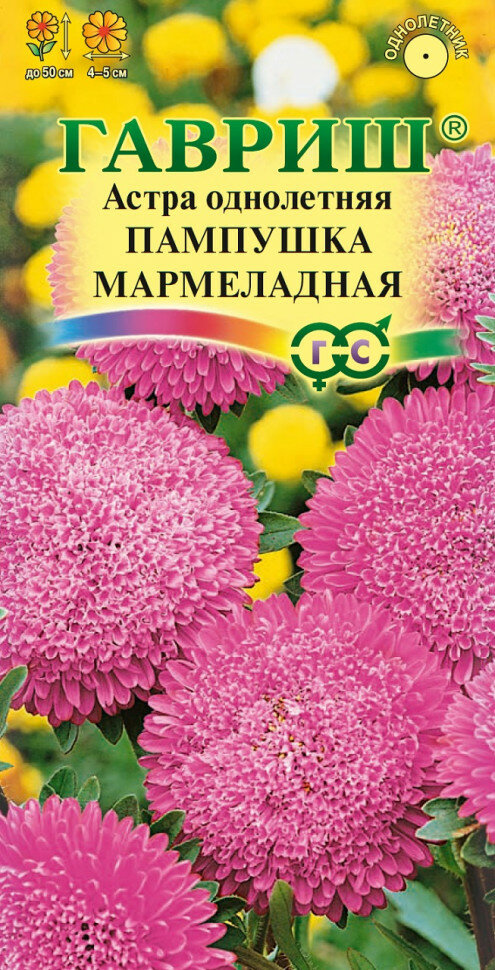Астра «Пампушка» «Мармеладная» — цветущий однолетник высотой до 50 см. Образует розовые полусферические цветы диаметром 4-5 см. Используется для составления букетов, украшения клумб и садовых участков. Любит освещенные места, удобренный суглинистый и супесчаный грунт. В открытую почву высаживается рассадой на рубеже весны и лета. Можно высевать семенами в цветниках накануне зимы, сеянцы будут сильными, холодостойкими и обильноцветущими.