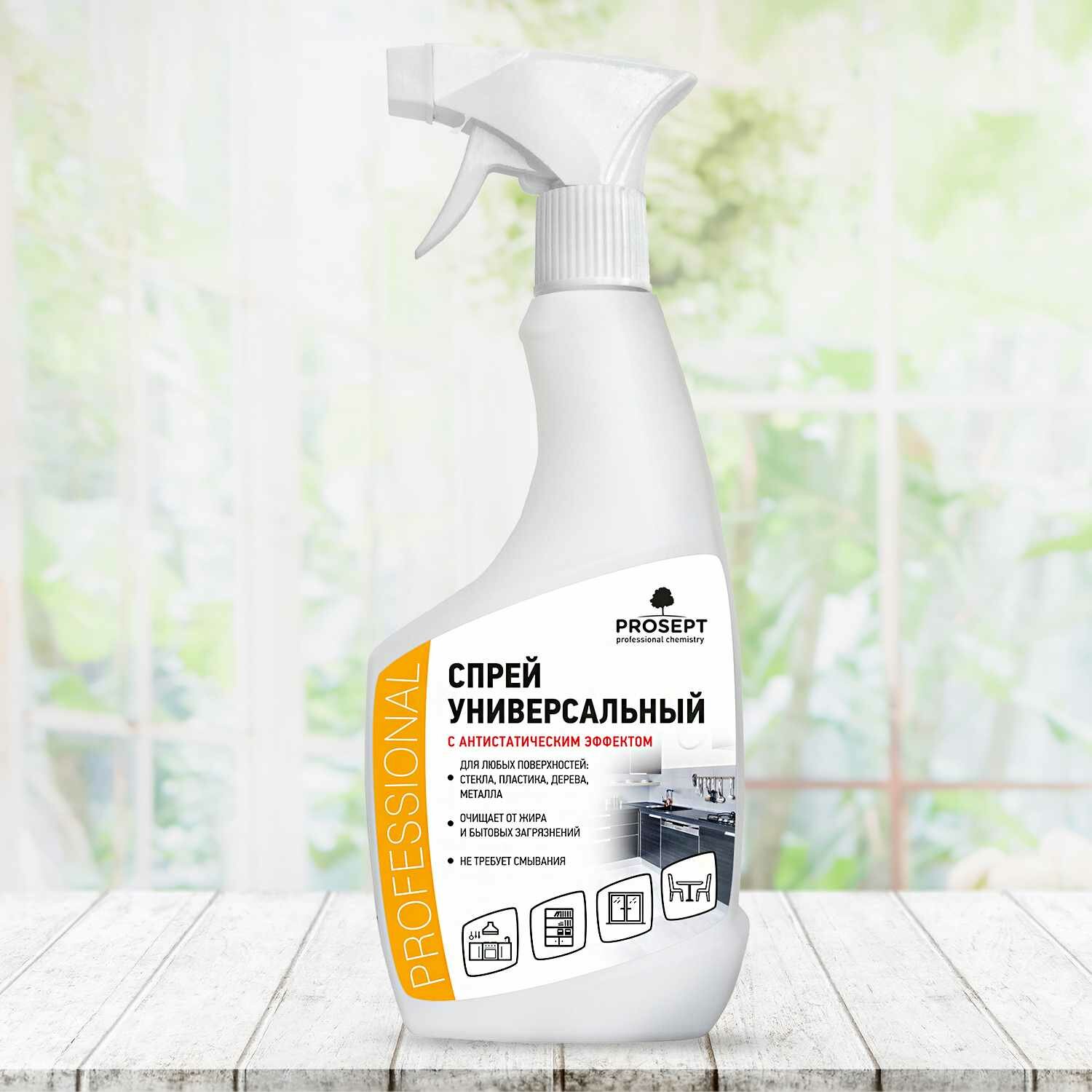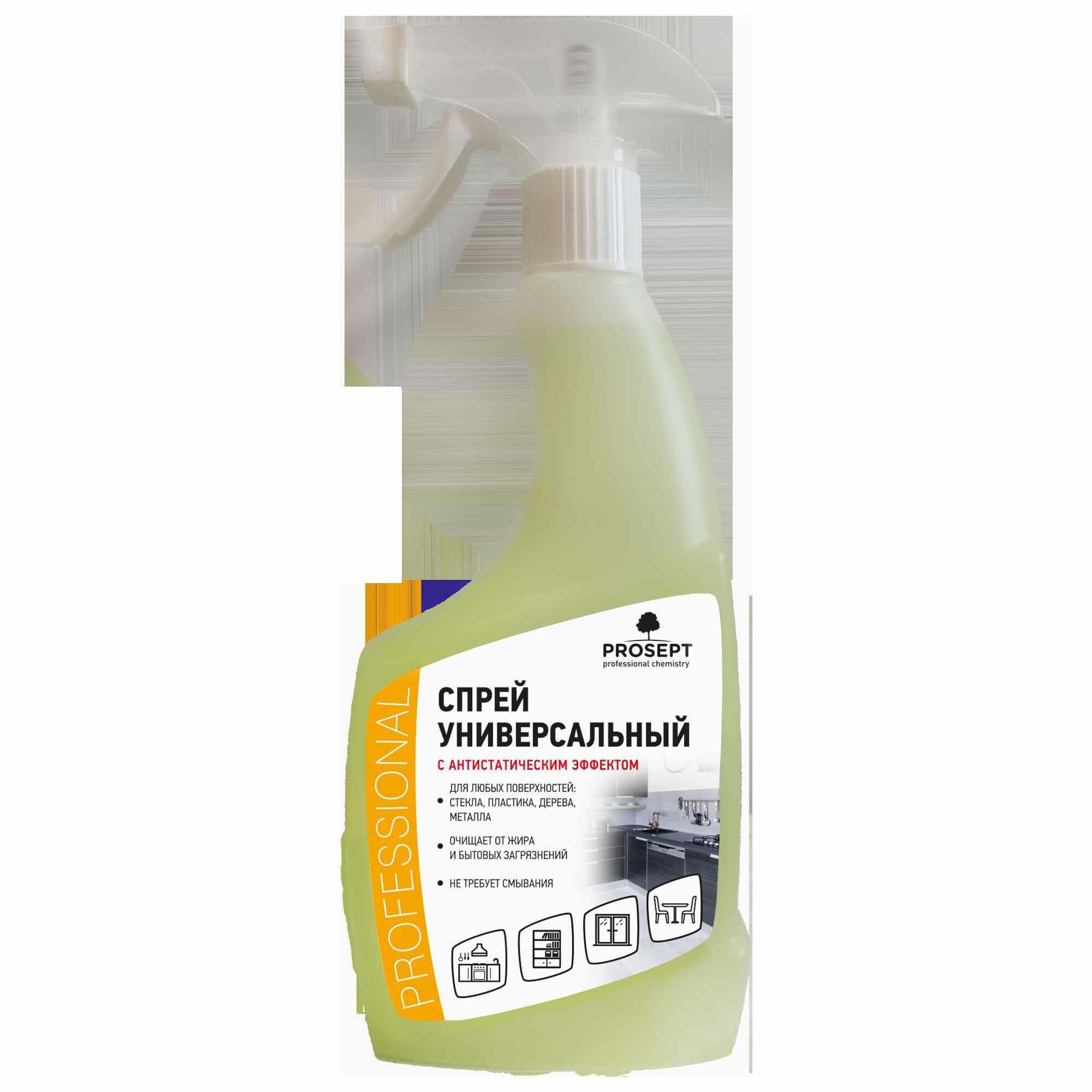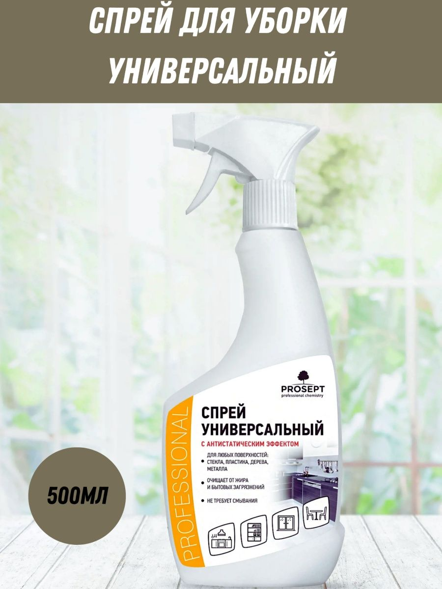 Спрей универсальный Prosept для уборки в доме 5 в 1 удаляет основные виды загрязнений со всех типов твердых поверхностей, в том числе глянцевых. Состав разработан для ухода за фасадами кухонной мебели, столешницами, стеновыми панелями, дверями и косяками, подоконниками, оргтехникой, теле-, аудио-, видеоаппаратурой, окнами и зеркалами, стенками холодильника и духовыми шкафами, автомобильными стеклами. Препятствует оседанию пыли, убирает грязь, отпечатки пальцев, следы жира, масла, косметики, чернил и пасты, клейкой ленты и клея.