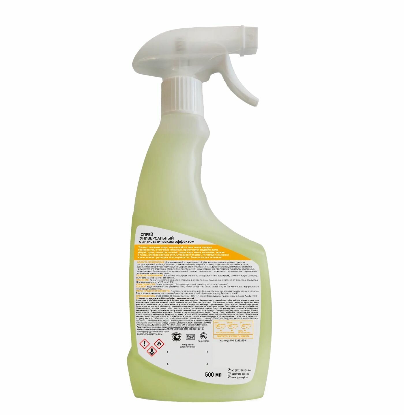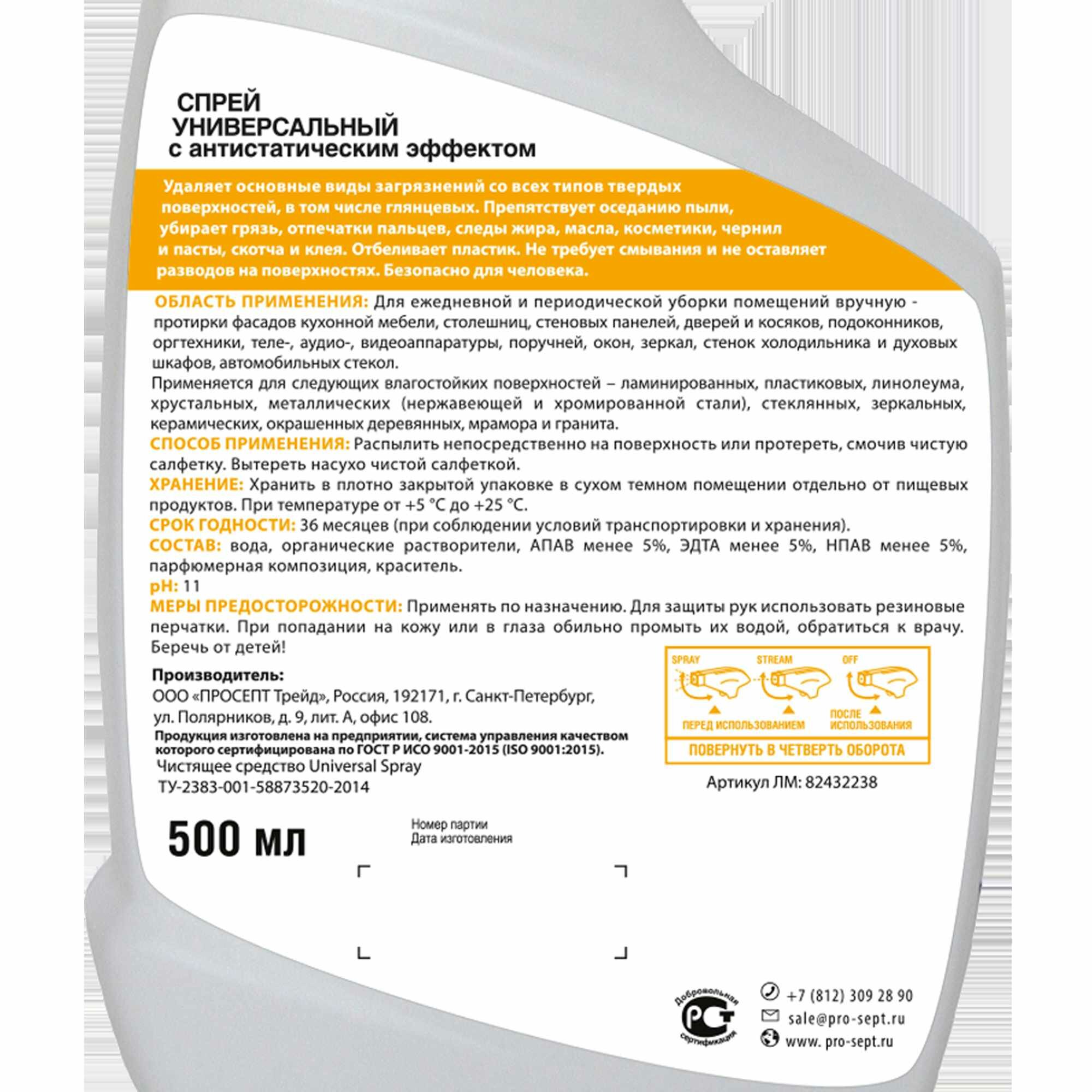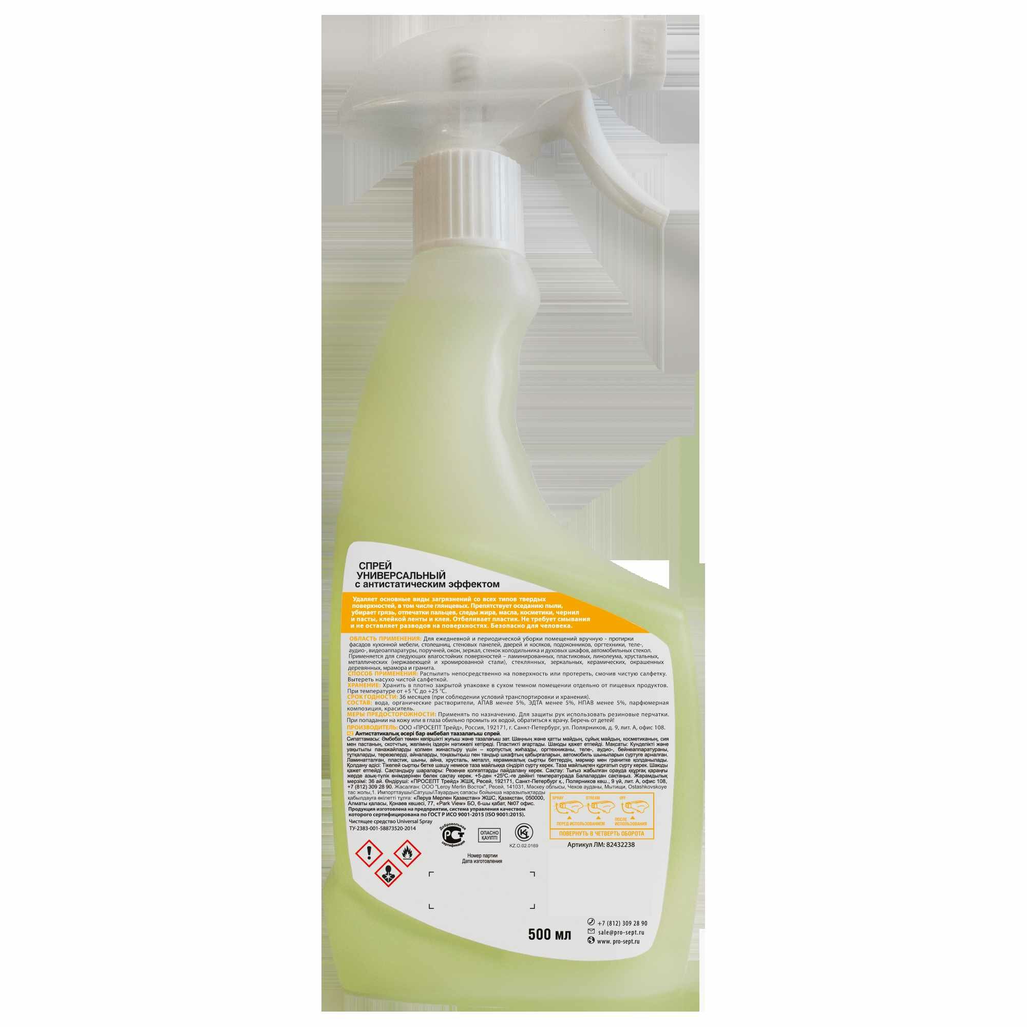 Спрей универсальный Prosept для уборки в доме 5 в 1 удаляет основные виды загрязнений со всех типов твердых поверхностей, в том числе глянцевых. Состав разработан для ухода за фасадами кухонной мебели, столешницами, стеновыми панелями, дверями и косяками, подоконниками, оргтехникой, теле-, аудио-, видеоаппаратурой, окнами и зеркалами, стенками холодильника и духовыми шкафами, автомобильными стеклами. Препятствует оседанию пыли, убирает грязь, отпечатки пальцев, следы жира, масла, косметики, чернил и пасты, клейкой ленты и клея.