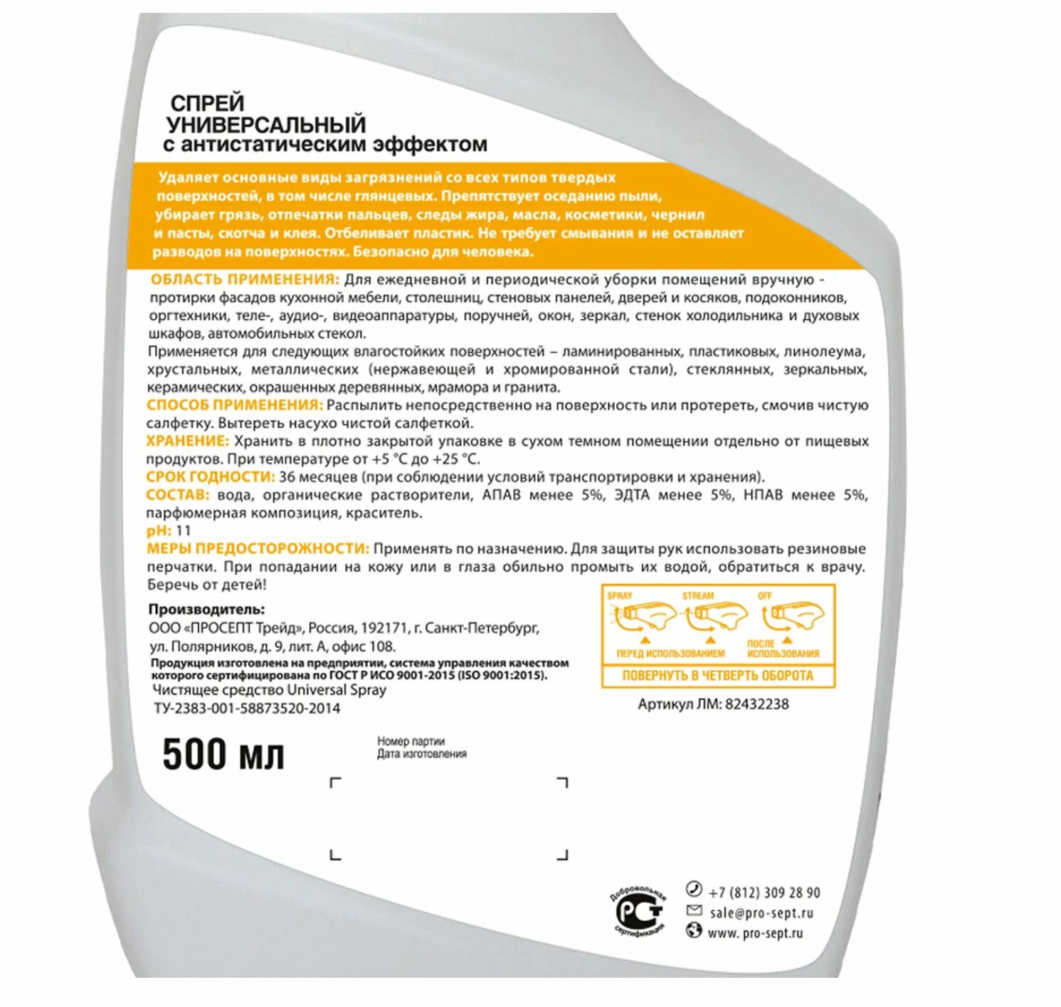 | Особенности продукта | ['Удаление загрязнений', 'Антистатическое средство', 'Универсальный'] |