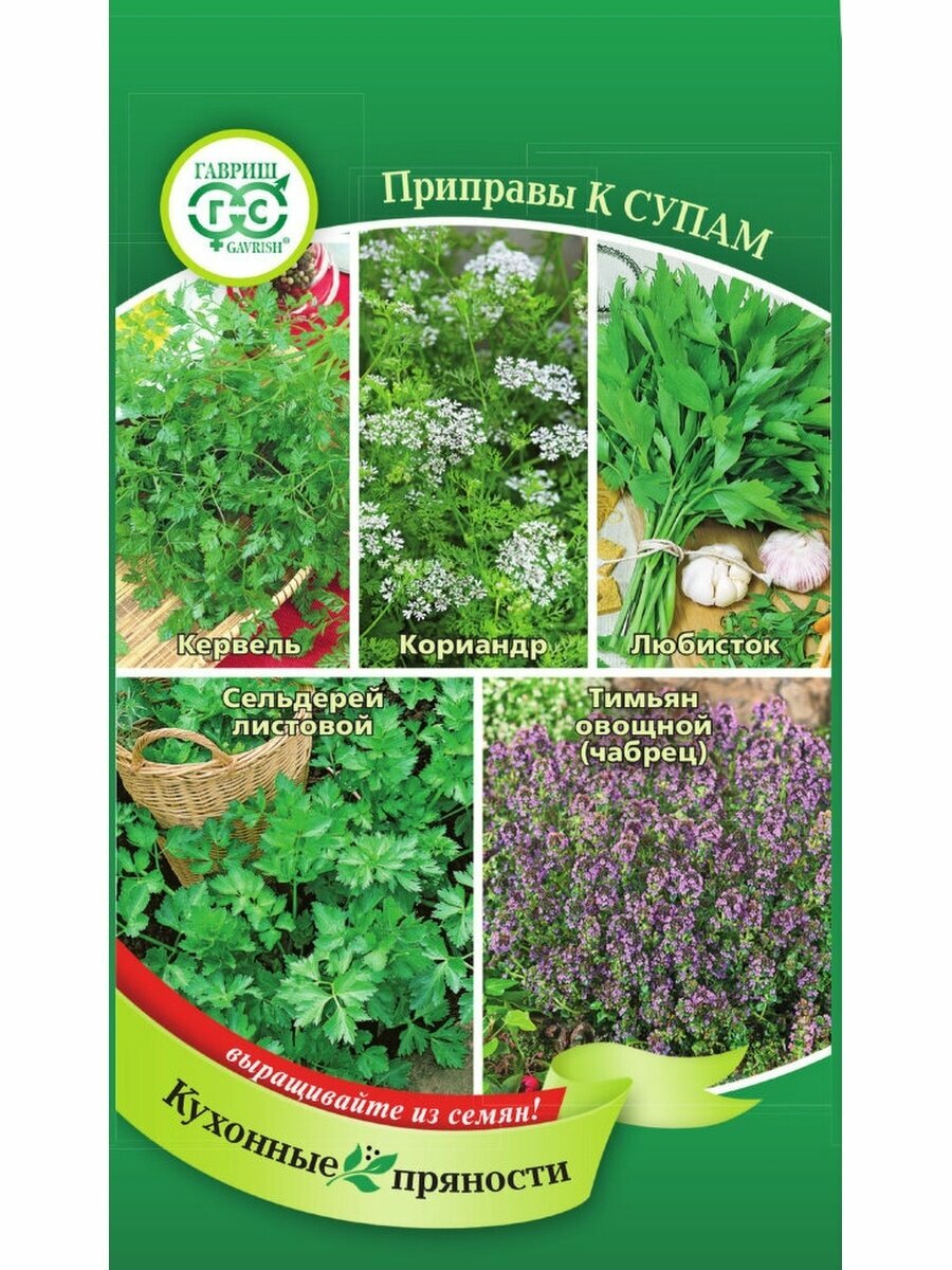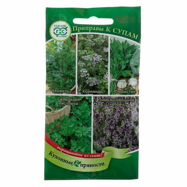 Кухонные пряности к супам — набор семян огородных растений, придающих блюдам пикантный вкус. Позволяет получить кервель, любисток, овощной тимьян и кориандр, корневой сельдерей. Культуры выращиваются прямым посевом в грунт или рассадным способом.