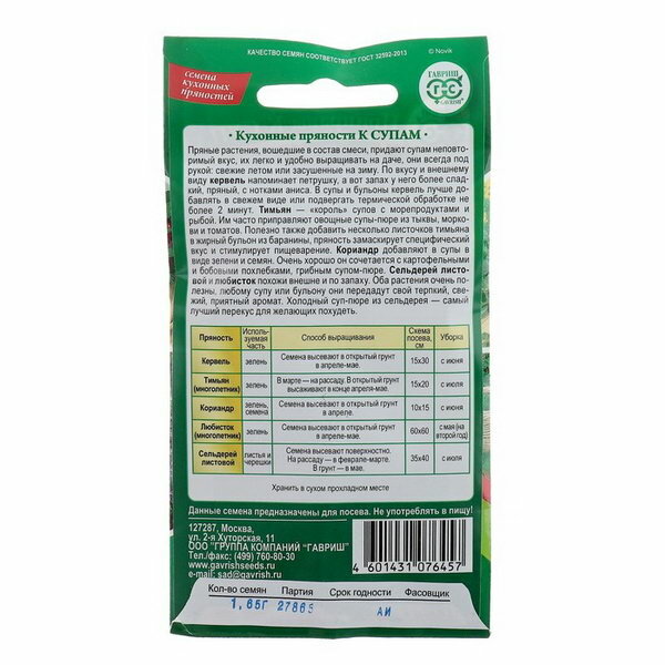 | Инструкция по применению | Пряные растения (кервель, кориандр, любисток, листовой сельдерей, тимьян), вошедшие в состав смеси придают супам неповторимый вкус, их легко и удобно выращивать на даче, они всегда под рукой, свежие — летом или засушенные на зиму. |