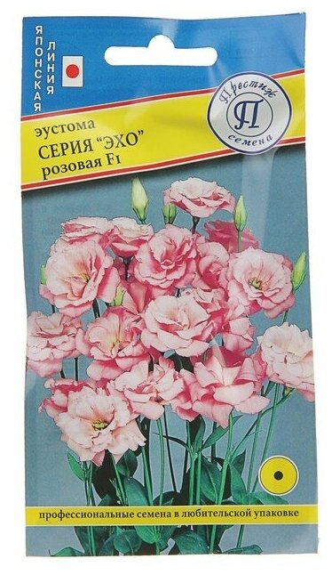 Эустома «Эхо» розовая F1 — раннецветущий гибрид для срезки и декорирования сада. Отличается крупными махровыми соцветиями нежного розового цвета. Вырастает до 70 см в высоту, стебли ровные, крепкие, выдерживают множество плотных бутонов. Теплолюбива.