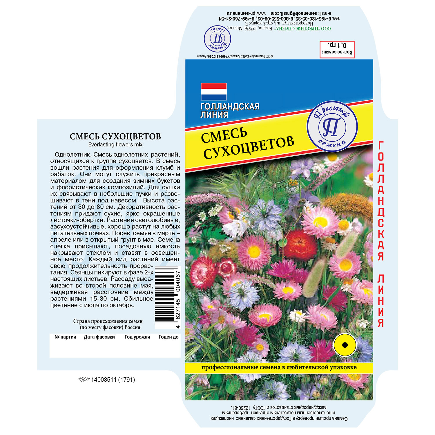 Смесь сухоцветов — привлекательный микс цветущих однолетников. Растения высотой 30-80 см с яркоокрашенными листочками используются для оформления клумб летом и составления цветочных композиций зимой. Цветут с июля до осенних заморозков, любят солнце, плодородную землю, устойчивы к засухе. Высаживаются в открытый грунт семенами или выращиваются рассадным способом.