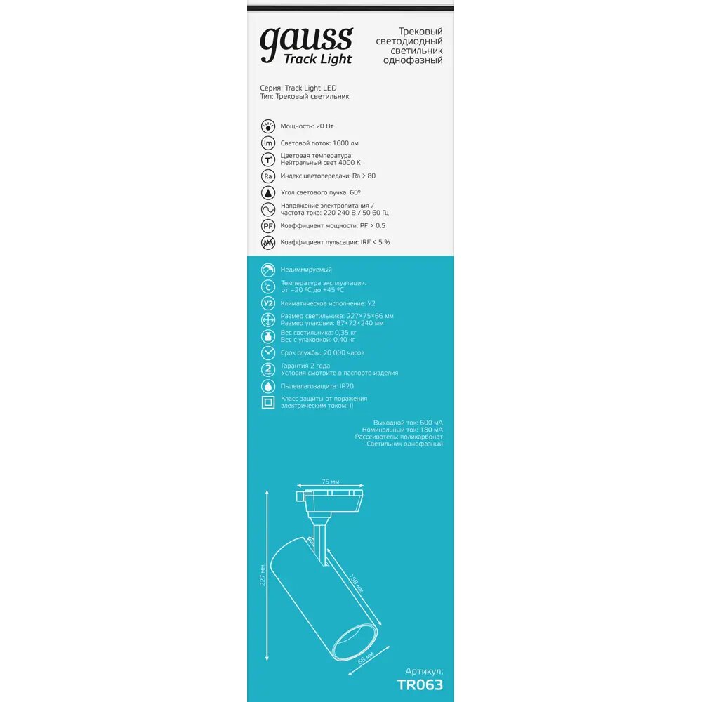 Трековый светильник Gauss светодиодный 20 Вт 4 м² цвет белый
