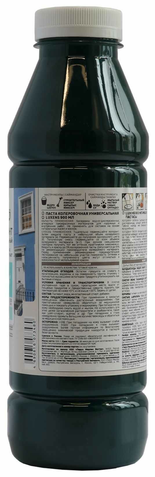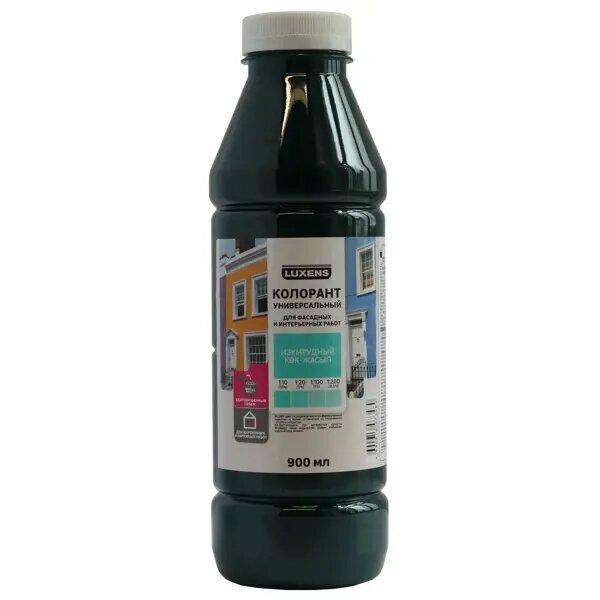 Колорант Luxens — концентрат для колеровки любых видов краски для фасадных или интерьерных работ. Подходит для любых поверхностей. Цвет — изумрудный. Получаемый оттенок можно корректировать в процессе смешения колеровочной пасты с базовым составом. Объем флакона — 0,9 л (хватит для колеровки краски объемом от 900 мл). Страна-производитель — Россия.