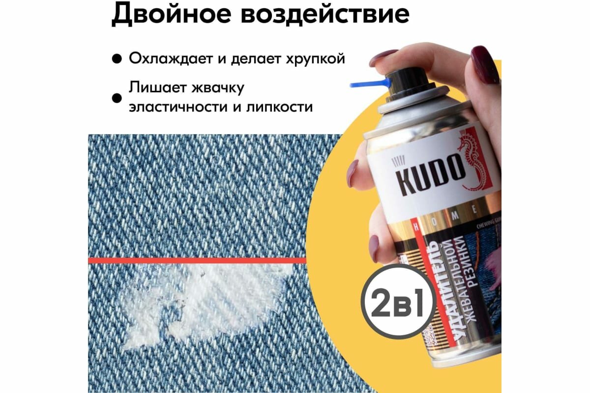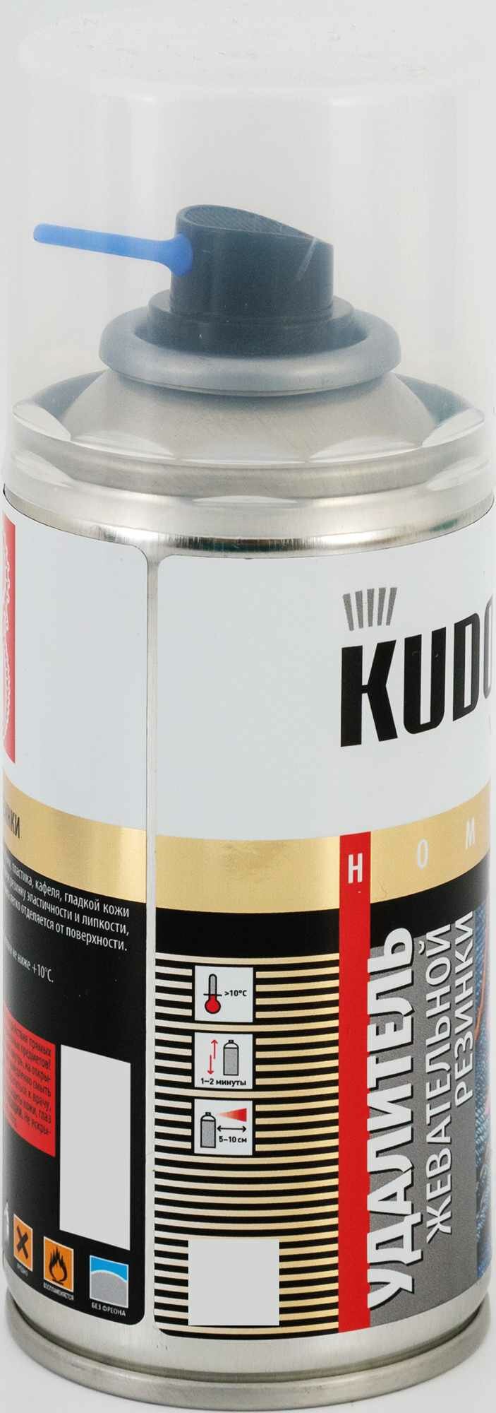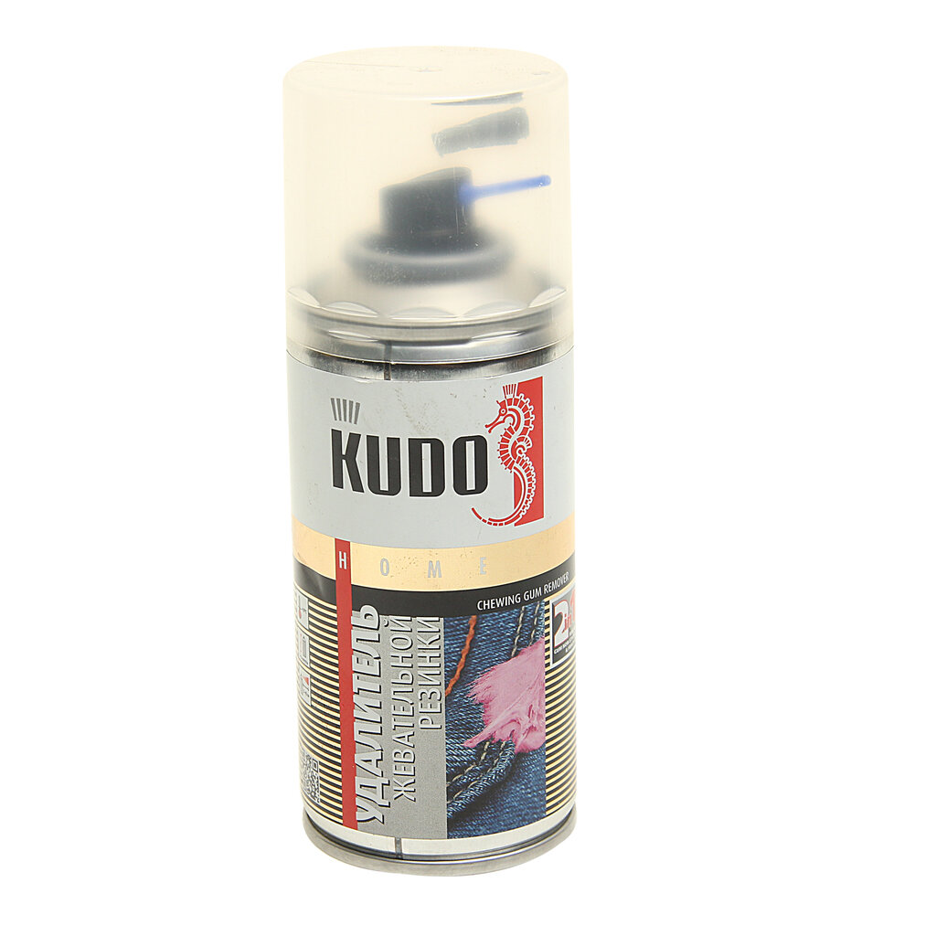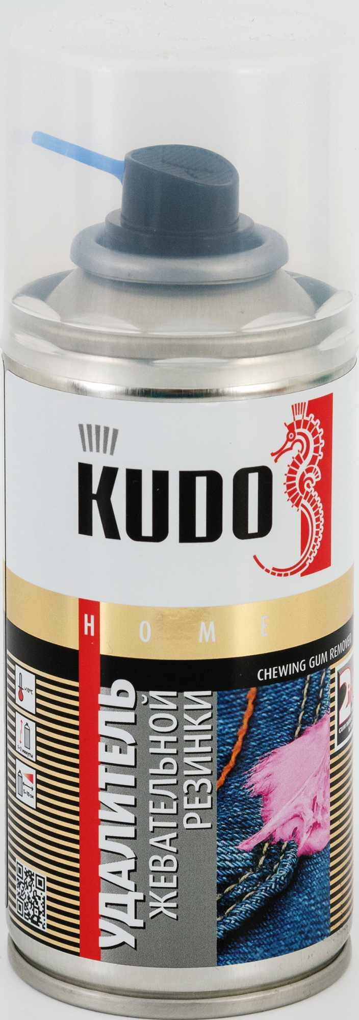 **Удалитель жевательной резинки Kudo** представлен в формате аэрозоля, которым можно обрабатывать поверхности из ткани, полимеров, древесины, гладкой кожи, кафеля. При нанесении жидкое средство вступает в реакцию с материалом жевательной резинки, лишает ее липких свойств, охлаждает и придает хрупкость. После обработки изделие без усилий отделяется от поверхности, а оставшиеся после него мелкие крошки и следы удаляются с помощью щетки.