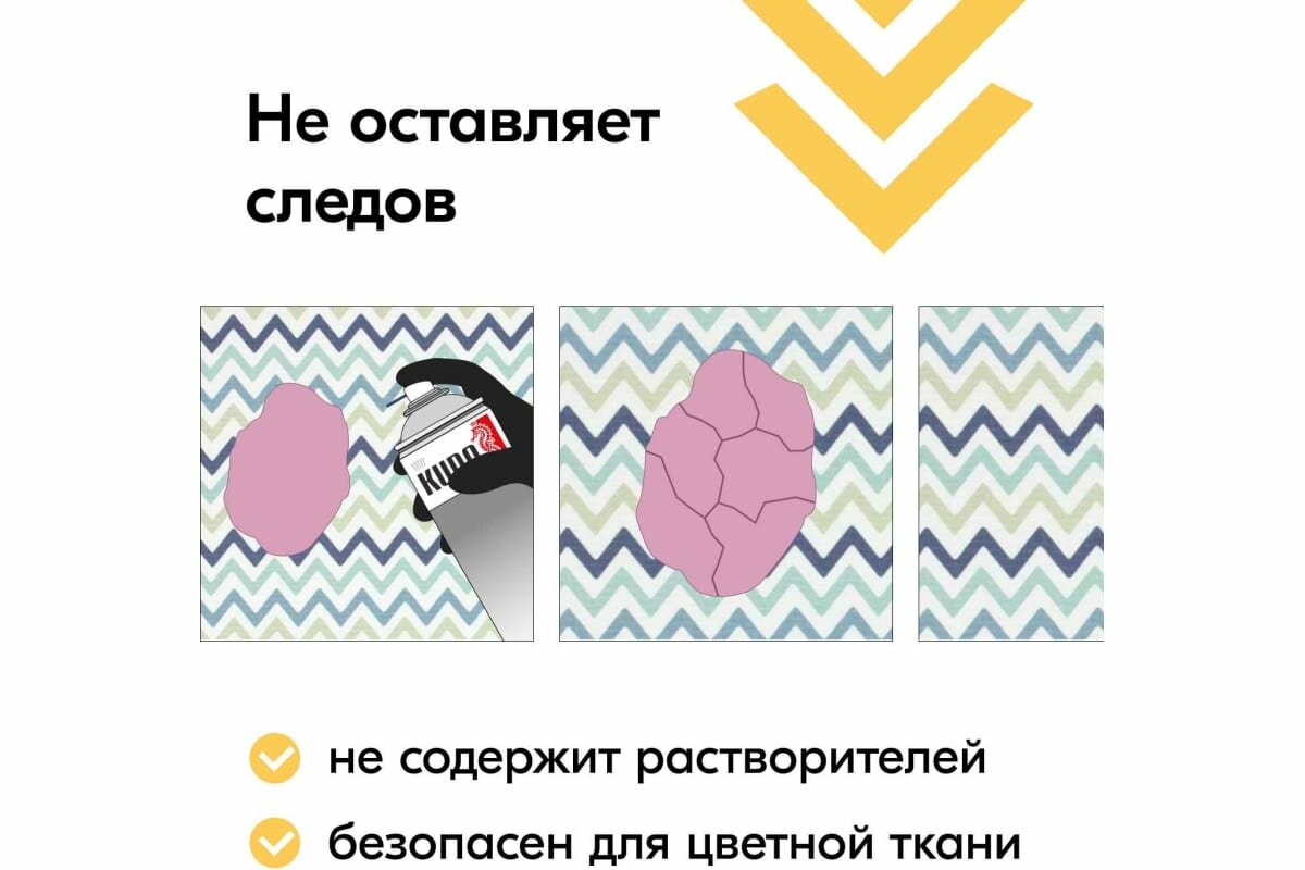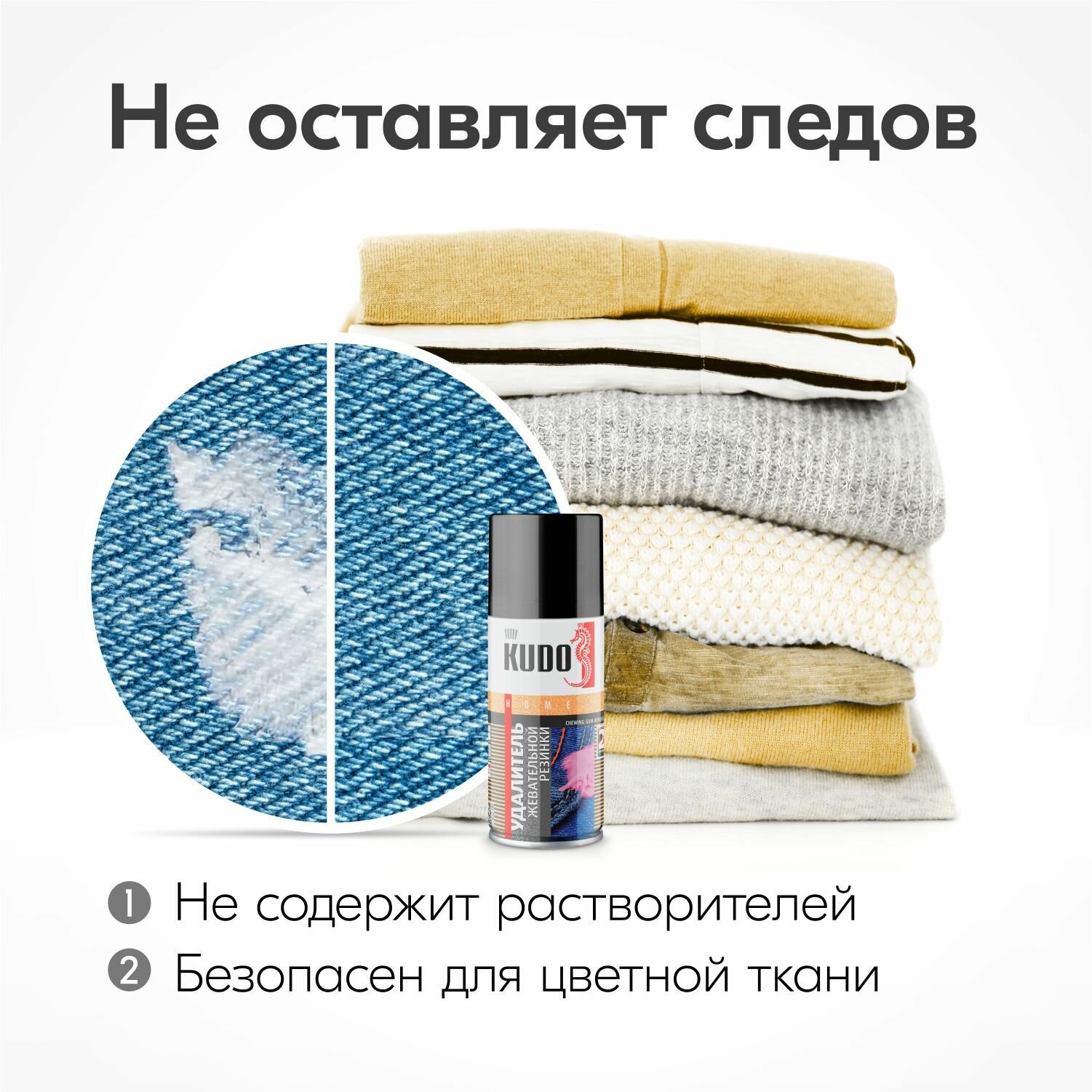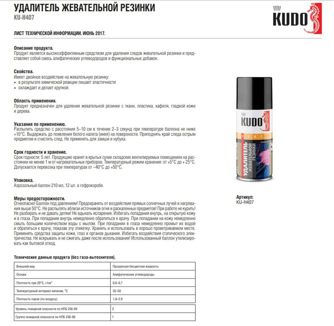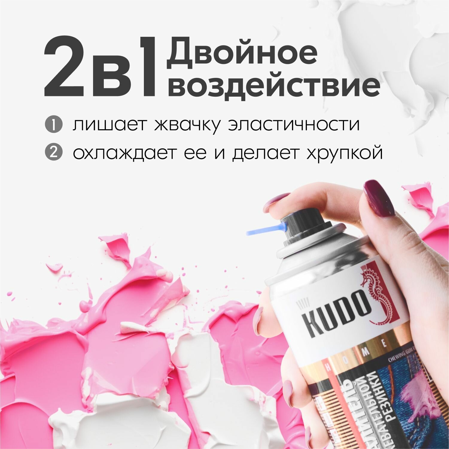 **Удалитель жевательной резинки Kudo** представлен в формате аэрозоля, которым можно обрабатывать поверхности из ткани, полимеров, древесины, гладкой кожи, кафеля. При нанесении жидкое средство вступает в реакцию с материалом жевательной резинки, лишает ее липких свойств, охлаждает и придает хрупкость. После обработки изделие без усилий отделяется от поверхности, а оставшиеся после него мелкие крошки и следы удаляются с помощью щетки.