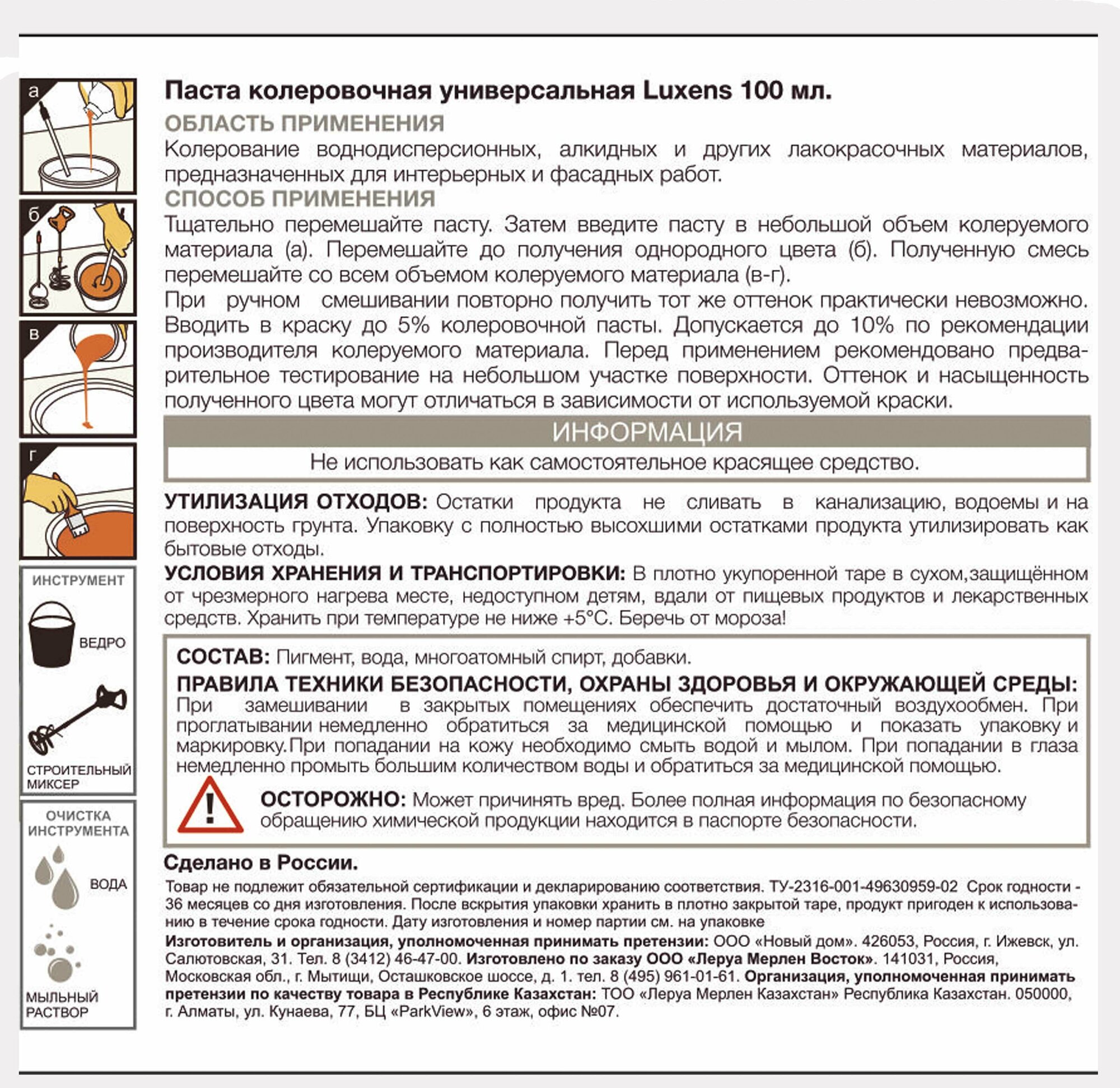 | Инструкция по применению | СПОСОБ ПРИМЕНЕНИЯ Тщательно перемешайте пасту. Затем введите пасту в небольшом объеме колеруемого материала. Перемешайте до получения однородного цвета. Полученную смесь перемешайте со всем объемом колеруемого материала. При ручном смешивании повторно получить тот же оттенок практически невозможно. Вводить в краску до 5% колеровочной пасты. Допускается до 10% по рекомендации производителя колеруемого материала. Перед применением рекомендовано предварительное тестирование на небольшом участке поверхности. Оттенок и насыщенность полученного цвета могут отличаться в зависимости от используемой краски. ИНФОРМАЦИЯ Не использовать как самостоятельное красящее средство. УТИЛИЗАЦИЯ ОТХОДОВ: Остатки продукта не сливать в канализацию, Водоемы и на поверхность грунта. Упаковку с полностью высохшими остатками продукта утилизировать как бытовой мусор. |