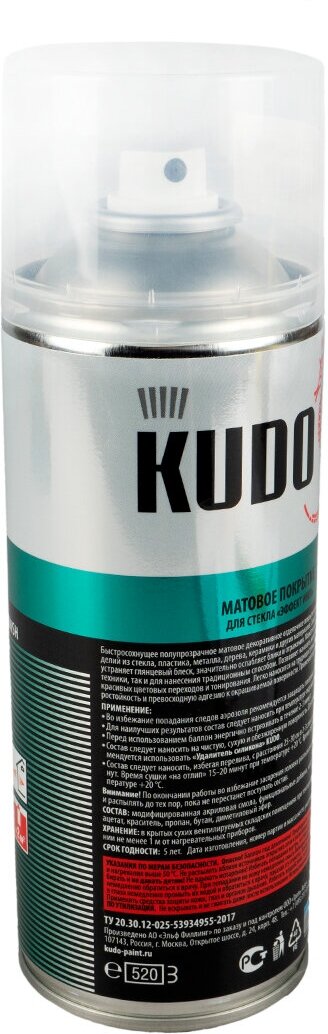 Покрытие аэрозольное Kudo для стекла цвет зелёный 0.52 л - быстросохнущее полупрозрачное матовое декоративное покрытие создает эффект тонировки. Предназначено для декорирования изделий из стекла, таких как окна, зеркала, витражи, вазы, фонари и другие предметы интерьера. Пропускает свет.