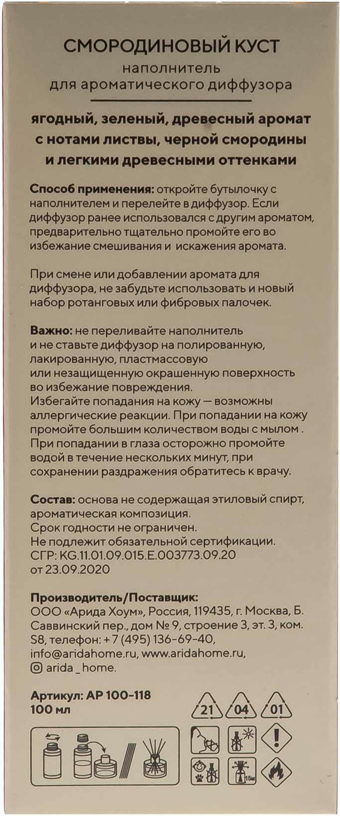 | Инструкция по применению | Открыть бутылочку с наполнителем и перелить в диффузор. |