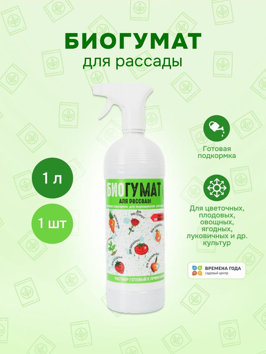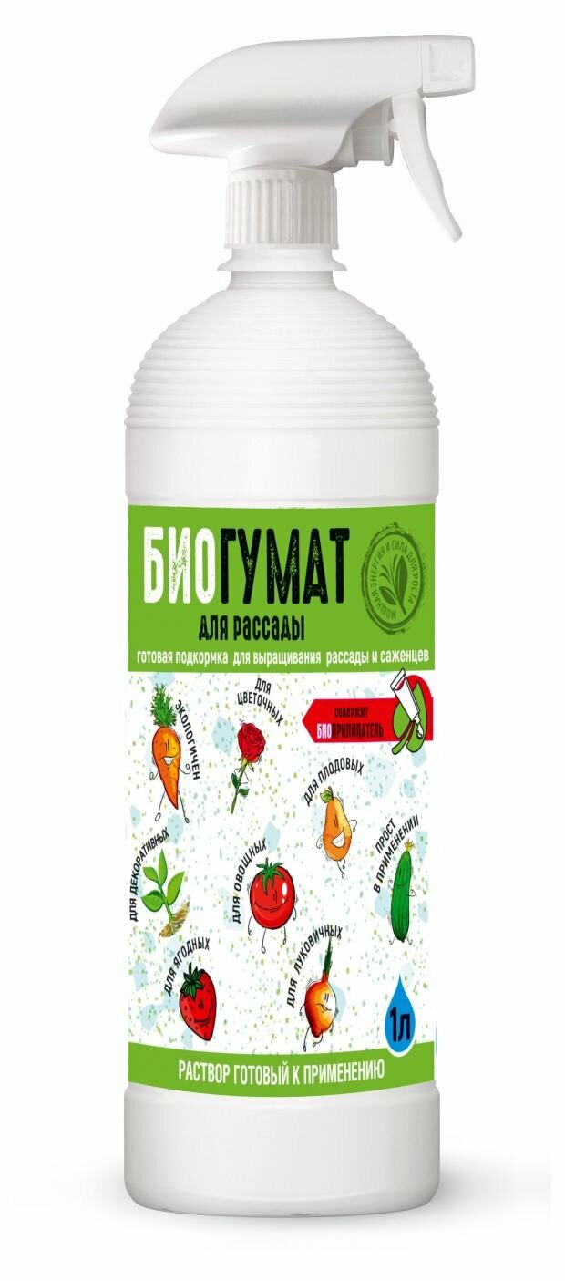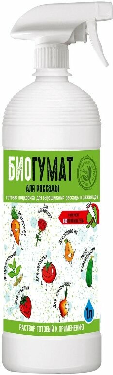 Биогумат для рассады — удобрение в удобной упаковке с помпой-распылителем. Предназначено для подкормки саженцев, рассады цветочных, овощных и ягодных культур. Экологически безопасно, содержит необходимые для активного роста и развития растений гуминовую кислоту, фосфор, азот, калий.