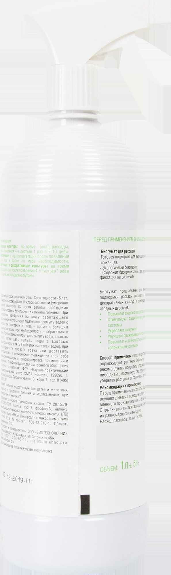 | Инструкция по применению | БИОГУМАТ для рассады Полностью готовая подкормка для выращивания рассады. Профилактика заболеваний. С биоприлепателем. |