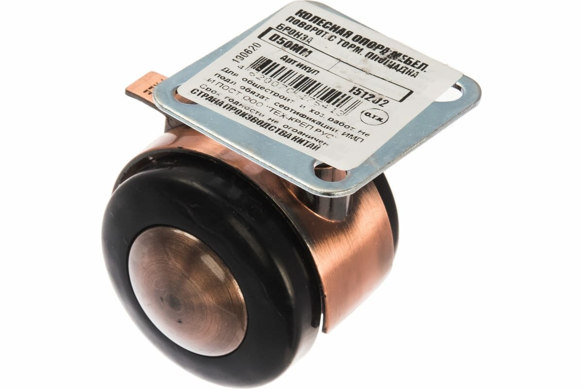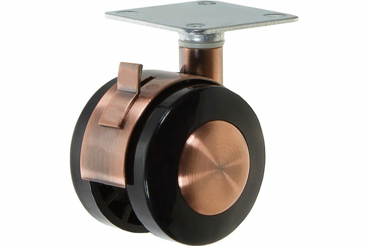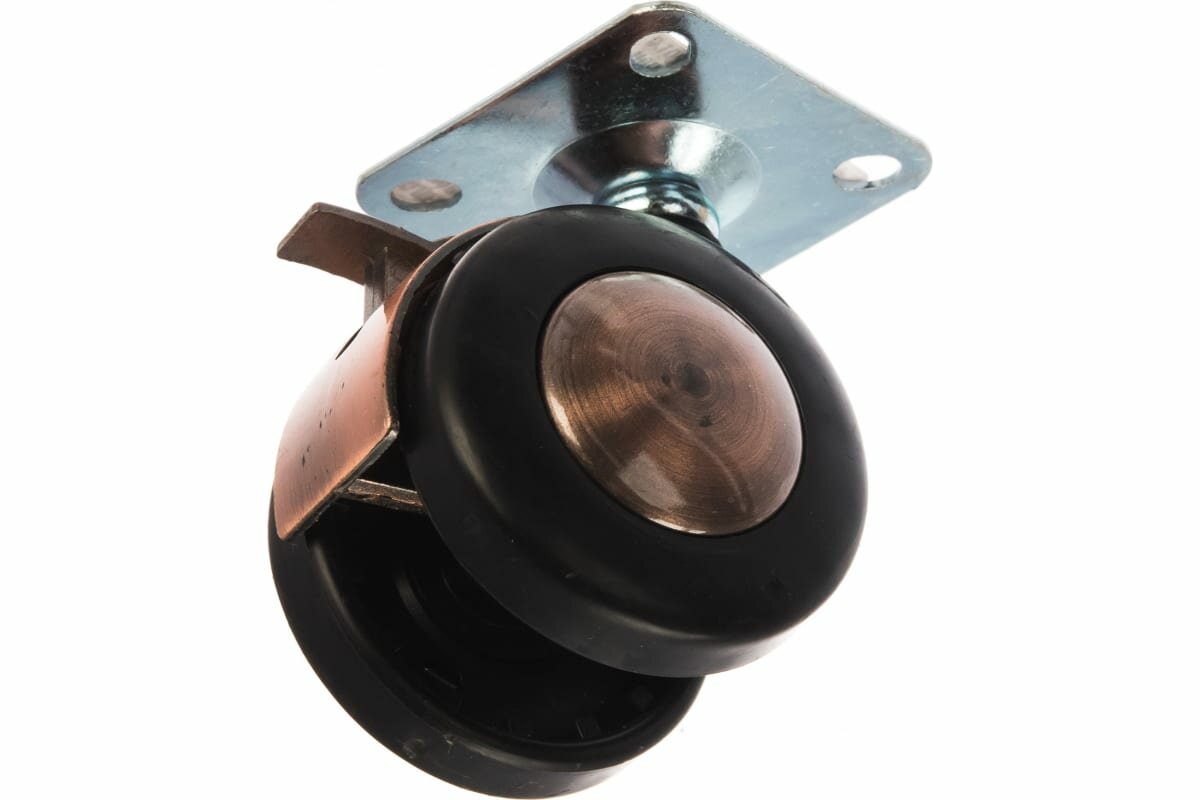 Колесо поворотное с тормозом и площадкой — компактная и функциональная опора для домашней и офисной мебели: кресел, столов, тумб. Устройство состоит из устойчивого сдвоенного колеса, металлической монтажной площадки и стопора, блокирующего движение механизма. Детали скрыты под эстетичным корпусом. Диаметр колеса — 50 мм. Цвета — черный и медный. Устройство рассчитано на нагрузку до 30 кг.