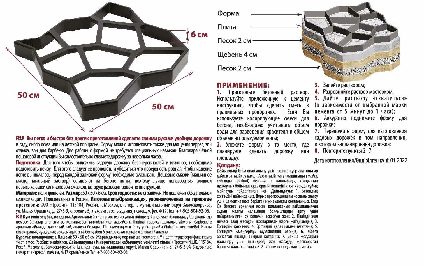 Форма для отливки садовых дорожек предназначена для самостоятельного изготовления бетонного покрытия из цементно-песчаной смеси. Поможет легко и быстро благоустроить сад, двор, уголок для отдыха. Проста в использовании, позволяет заливать дорожку постепенно, небольшими фрагментами. Размер — 50 × 50 × 6 мм.