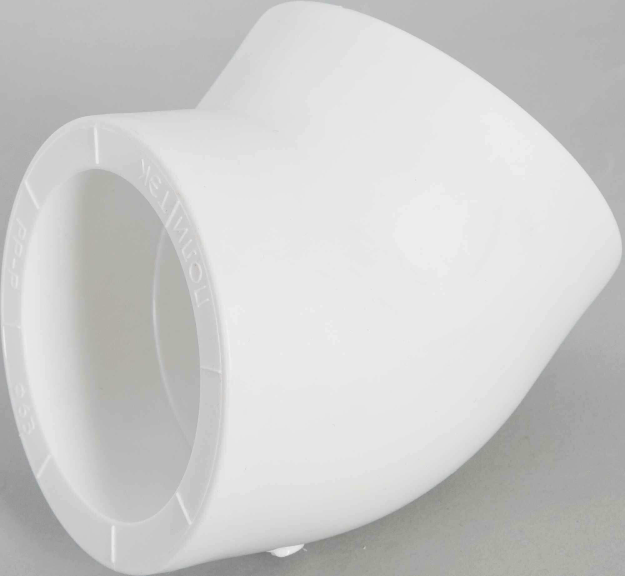 Угольник применяется для соединения труб диаметром 63 мм под углом 45°. Подходит для системы отопления и кондиционирования, рассчитан на перемещение жидкостей с температурой не выше 80 °C. Изготовлен из белого полипропилена толщиной 9,5 мм, монтируется посредством сварки (пайки).