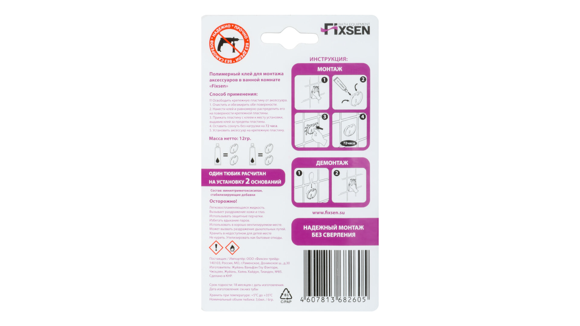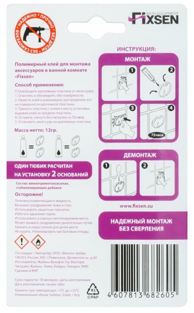 **Клей для монтажа аксессуаров Fixsen** изготовлен на основе полимеров. Предназначен для монтажа навесных элементов без сверления в помещениях с повышенным уровнем влажности. Обеспечивает высокую адгезию с большинством строительных материалов: камнем, бетоном, кирпичом, кафелем и т. д. Перед работой поверхность рекомендуется обезжирить.