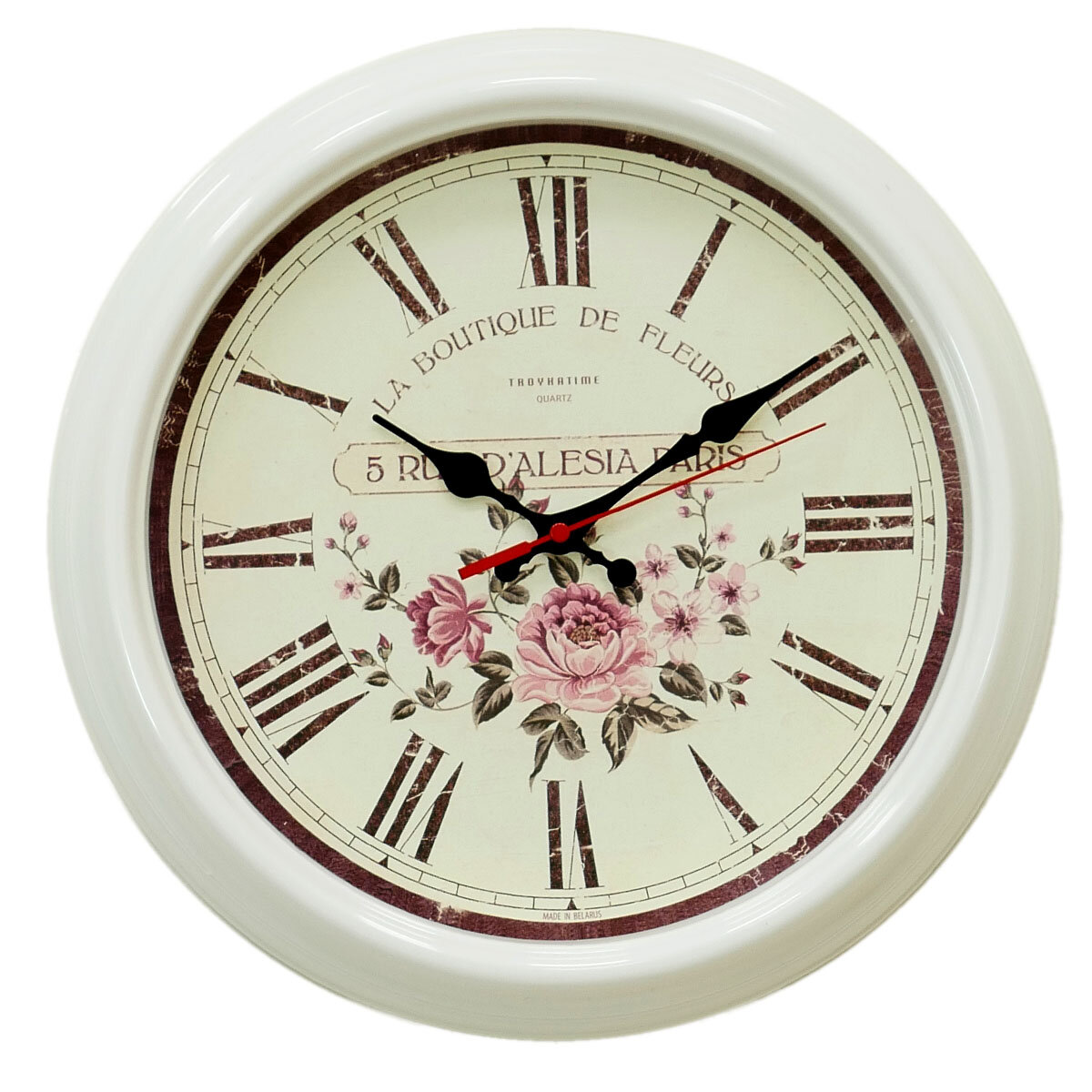 Часы настенные Troykatime La Boutique de Fleurs — предмет интерьера с прованским «акцентом», придающий помещению стиль французского шато. Часы выполнены в сдержанной цветовой гамме, оформлены цветочным рисунком. На циферблате нанесены лаконичные надписи, цифры — крупные. Основной цвет — белый. Циферблат круглой формы, диаметр корпуса — 30,5 см. Основной материал изделия — пластик. Часы имеют тихий ход. Страна-производитель — Беларусь. Заводская гарантия — 1 год, для работы требуются батарейки типа AA (в комплект не входят).
