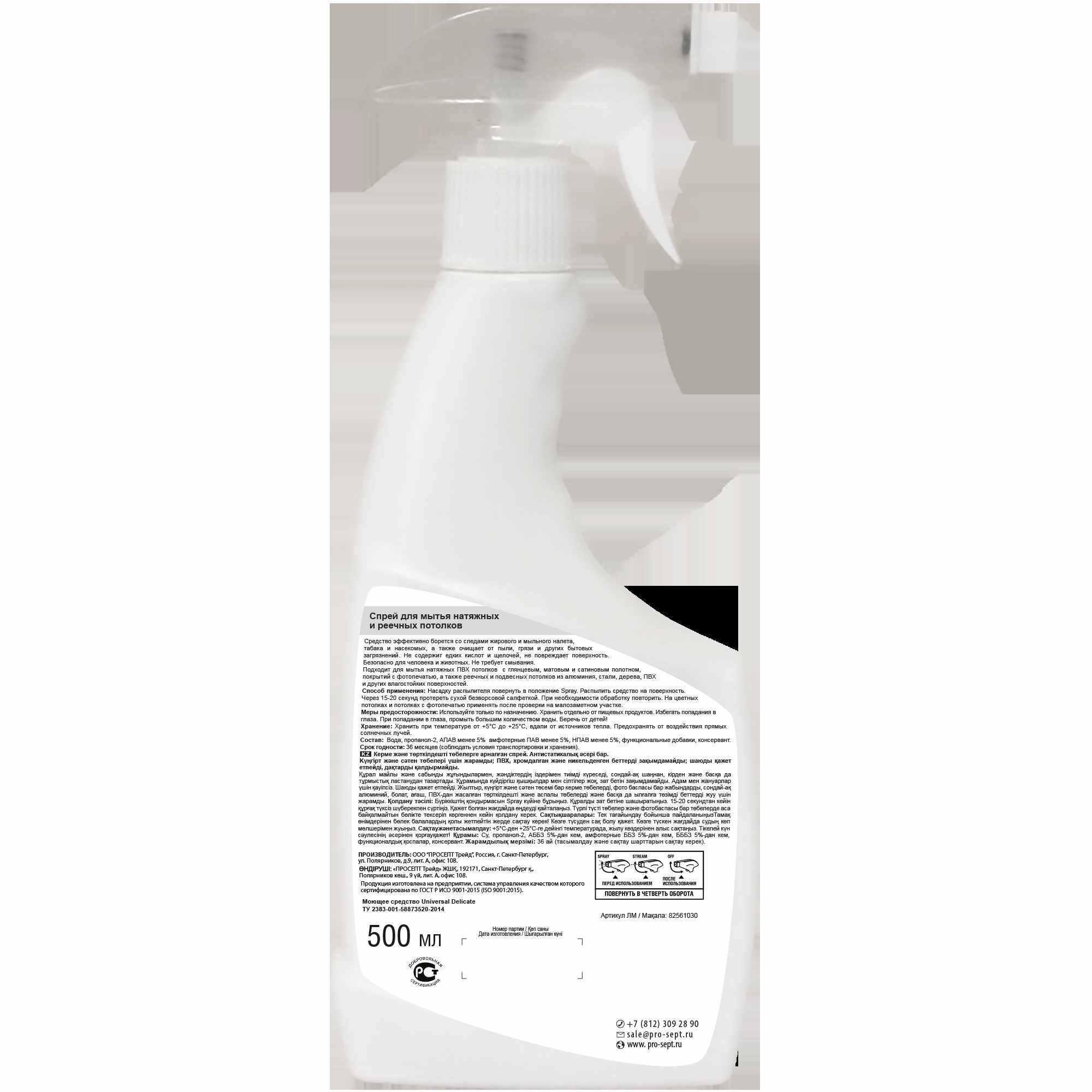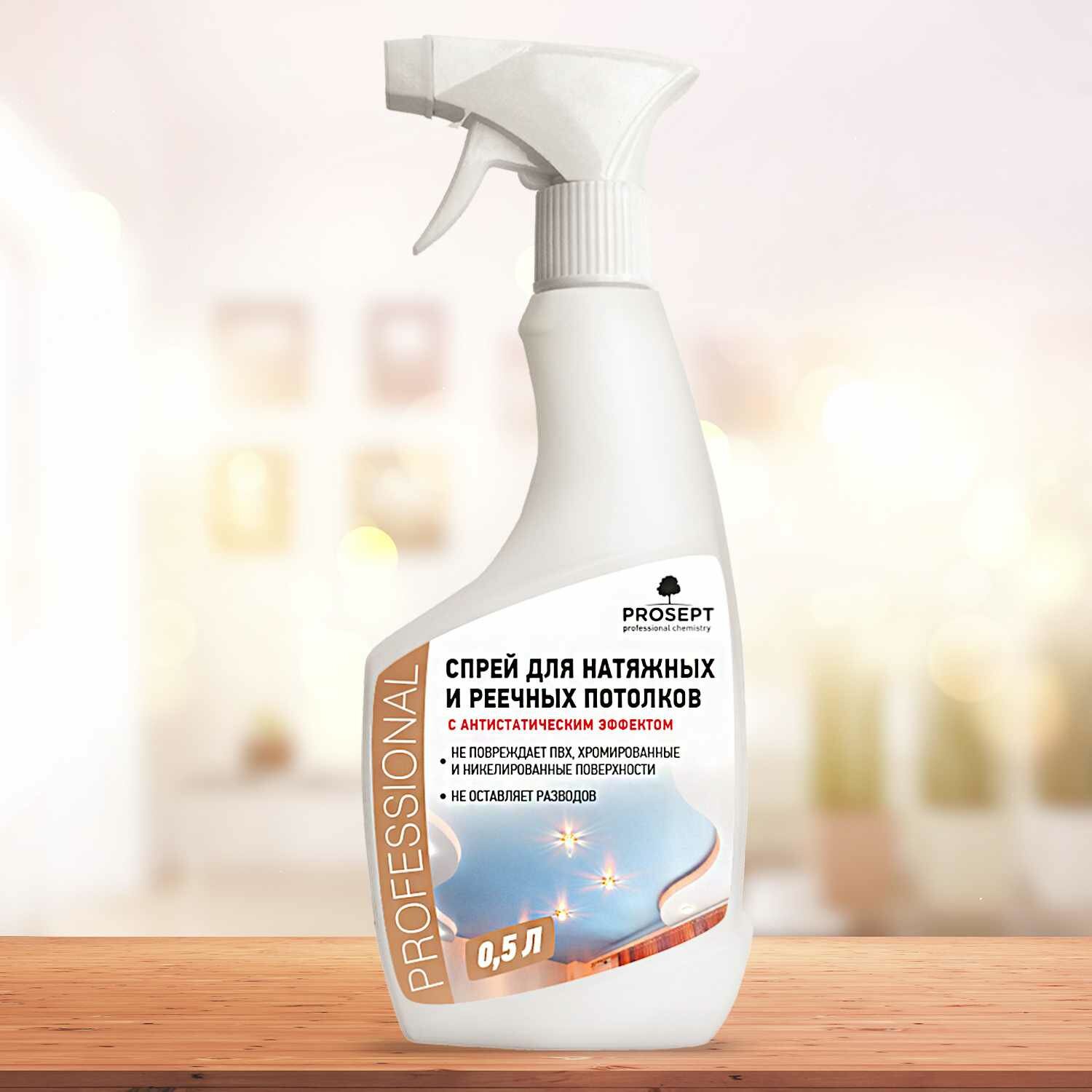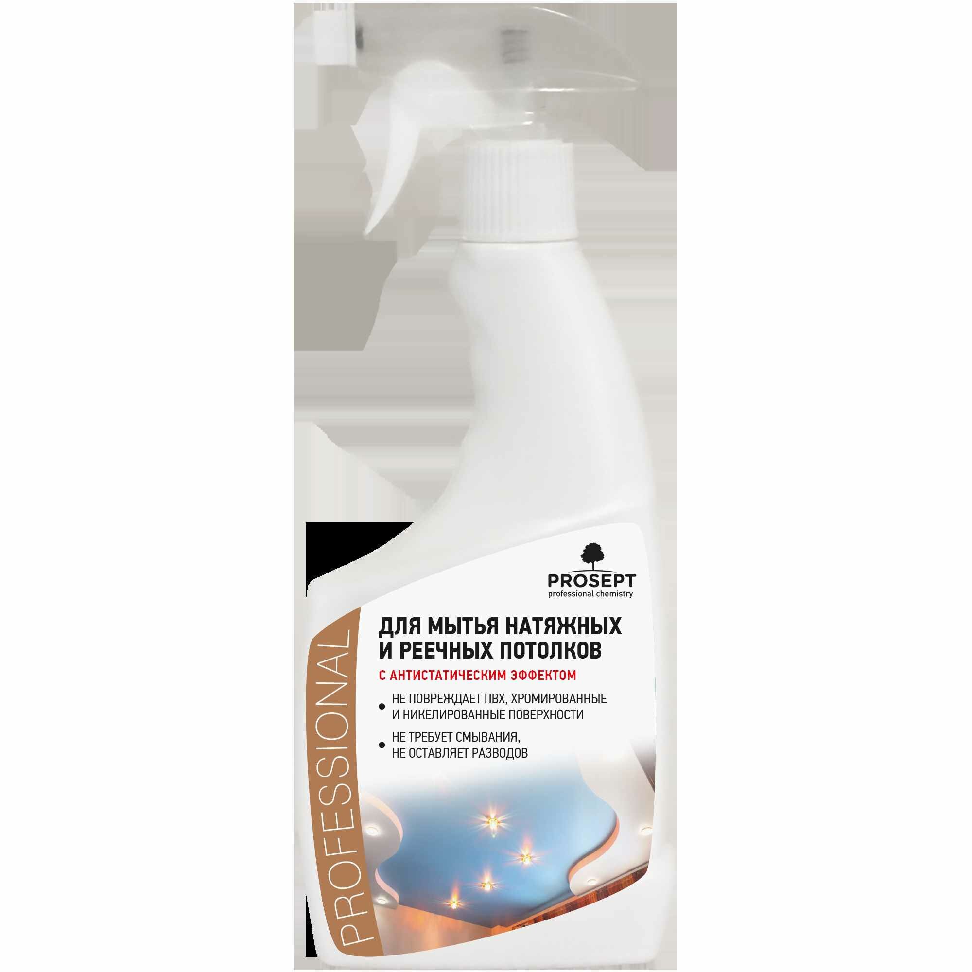Спрей для очистки потолков Prosept – готовое средство для мытья натяжных ПВХ потолков с глянцевым, матовым и сатиновым полотном, покрытий с фотопечатью, а также реечных и подвесных потолков из алюминия, стали, дерева, ПВХ и других влагостойких поверхностей. Эффективно борется со следами жирового и мыльного налета, табака и насекомых, а также очищает от пыли, грязи и других бытовых загрязнений.