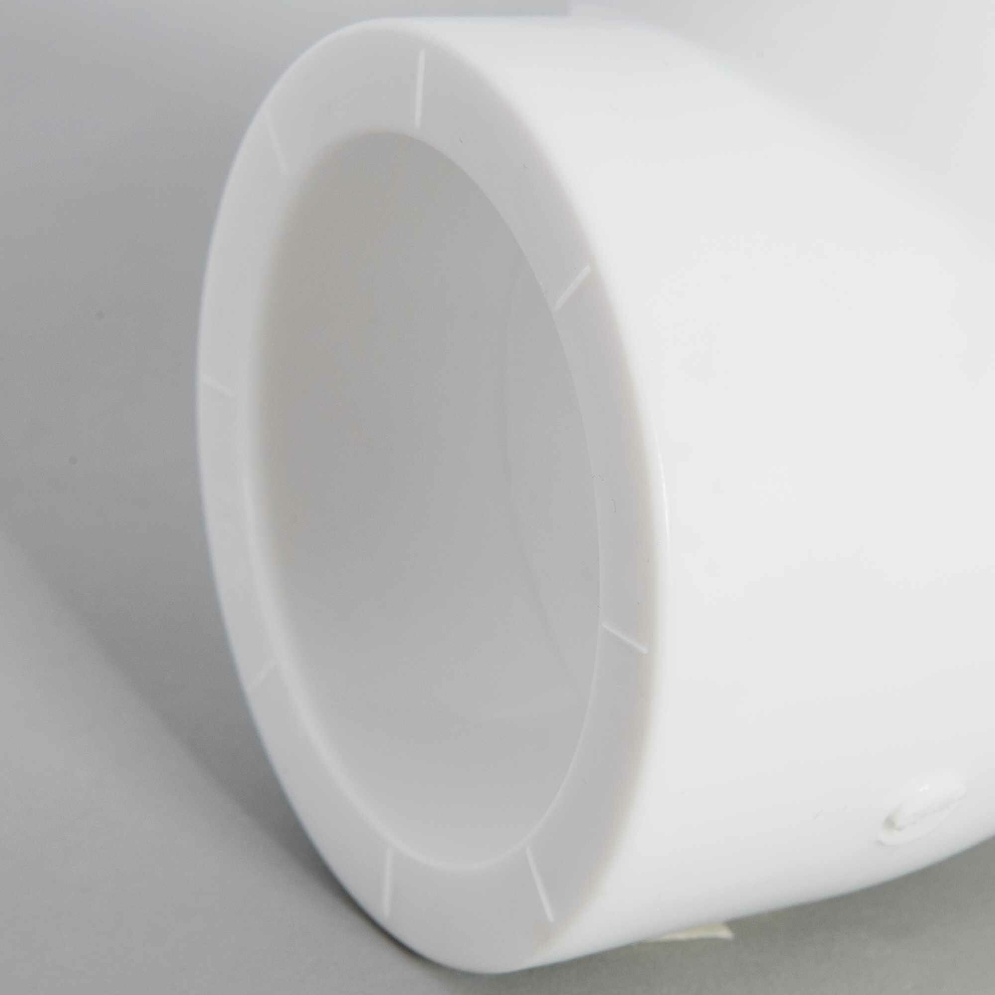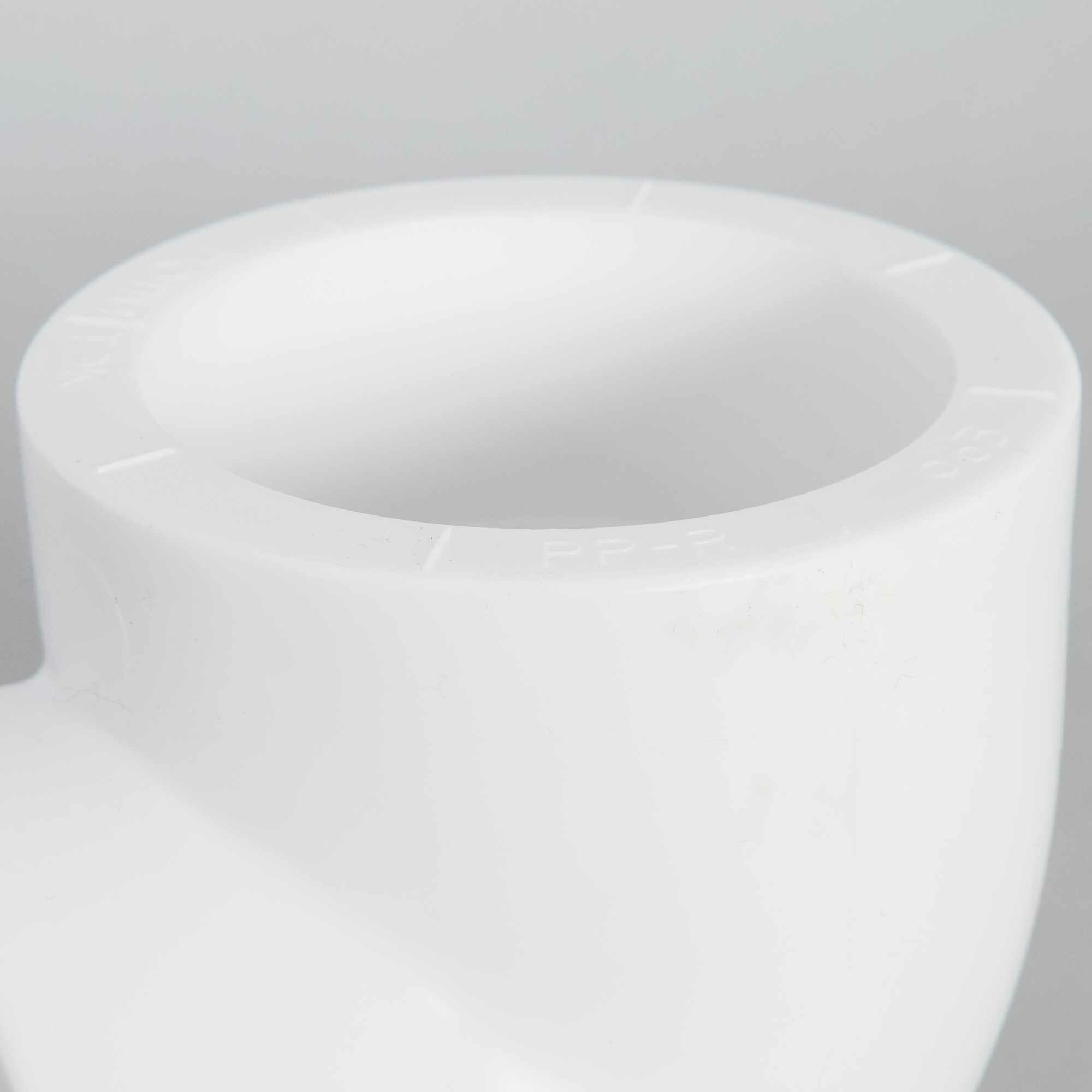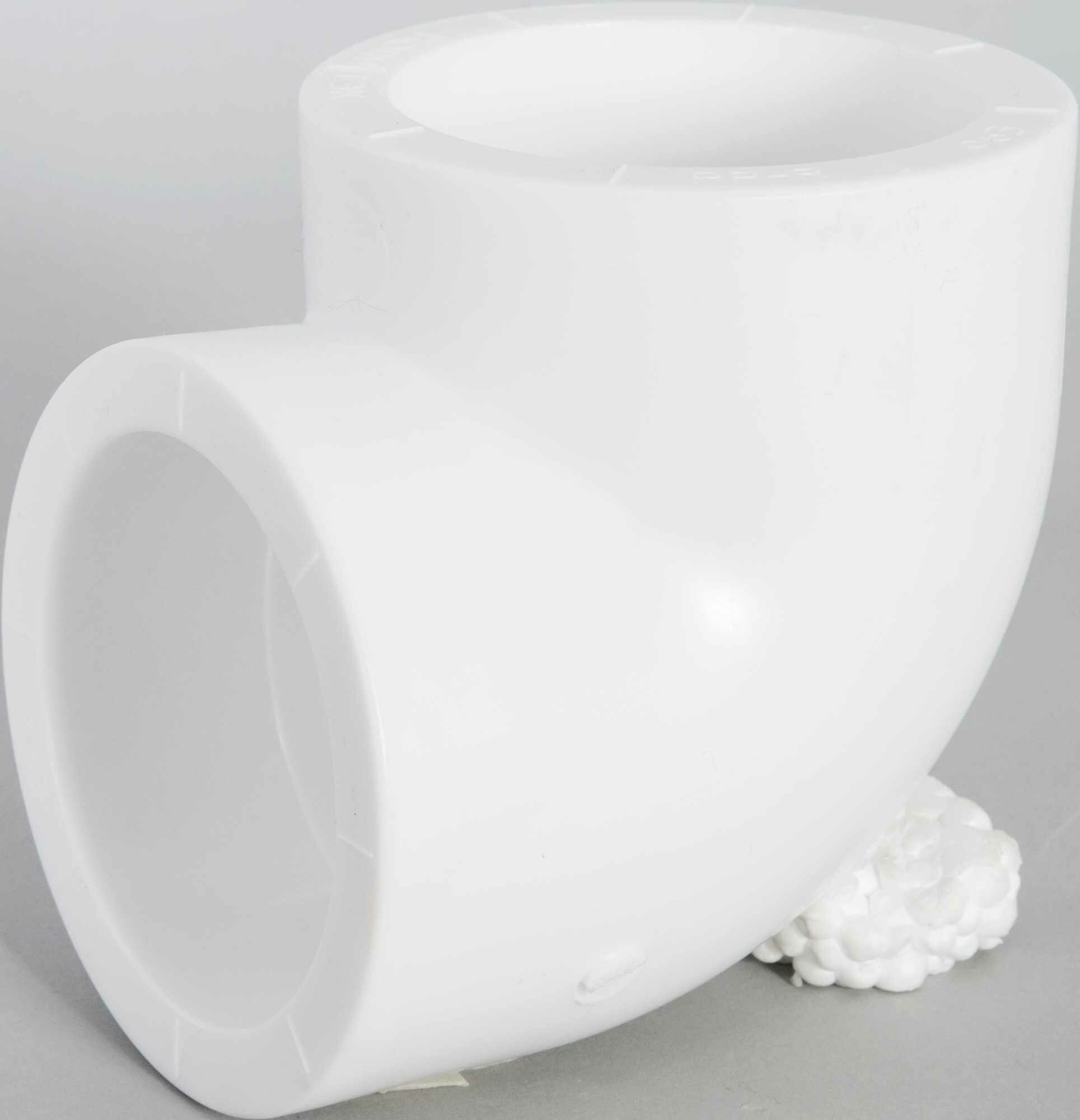 Угольник применяется для соединения труб диаметром 63 мм под углом 90°. Подходит для системы отопления и кондиционирования, рассчитан на перемещение жидкостей с температурой не выше 80 °C. Изготовлен из белого полипропилена толщиной 8,4 мм, монтируется посредством сварки (пайки).