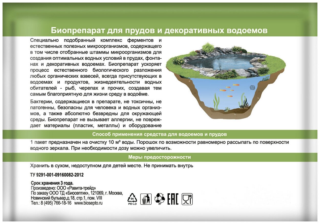 Биопрепарат не содержит патогенных и токсичных соединений, способных нанести вред здоровью человека и окружающей среде. Безопасен для пластика и металла, не повреждает оборудование. Одной упаковки (70 г) достаточно для очистки 10 м³ воды.