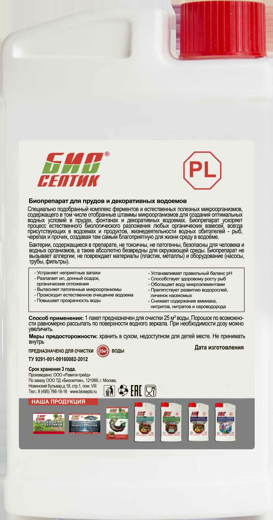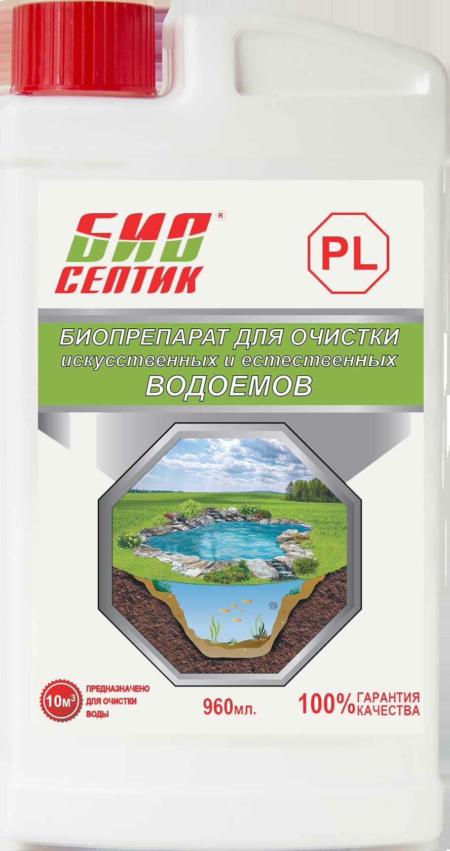 РL-средство для очистки водоёмов — комплекс ферментов и микроорганизмов, которые ускоряют процесс разложения органических соединений и восстанавливают нормальный кислотно-щелочной баланс воды. Средство подходит для любых водоемов природного и искусственного происхождения.