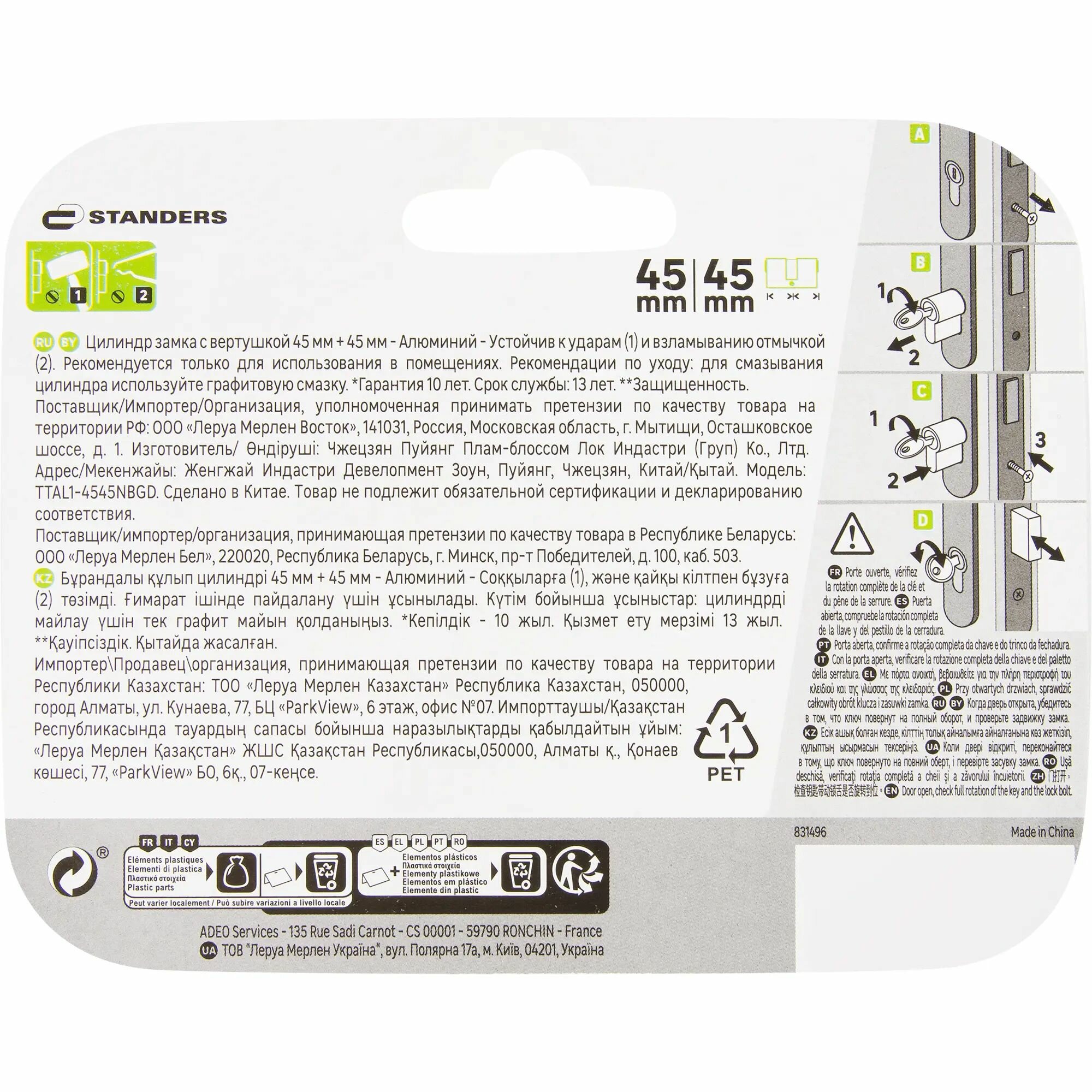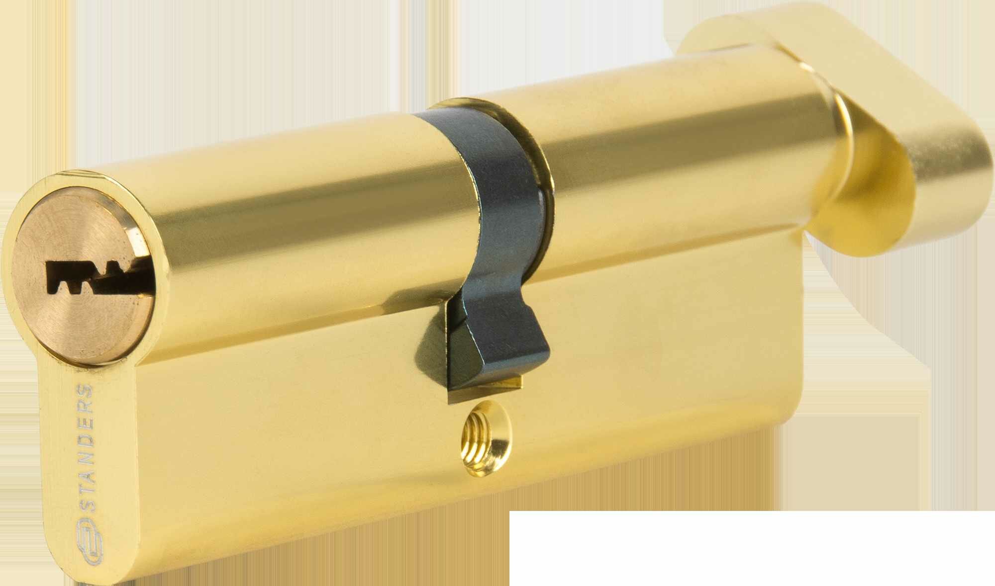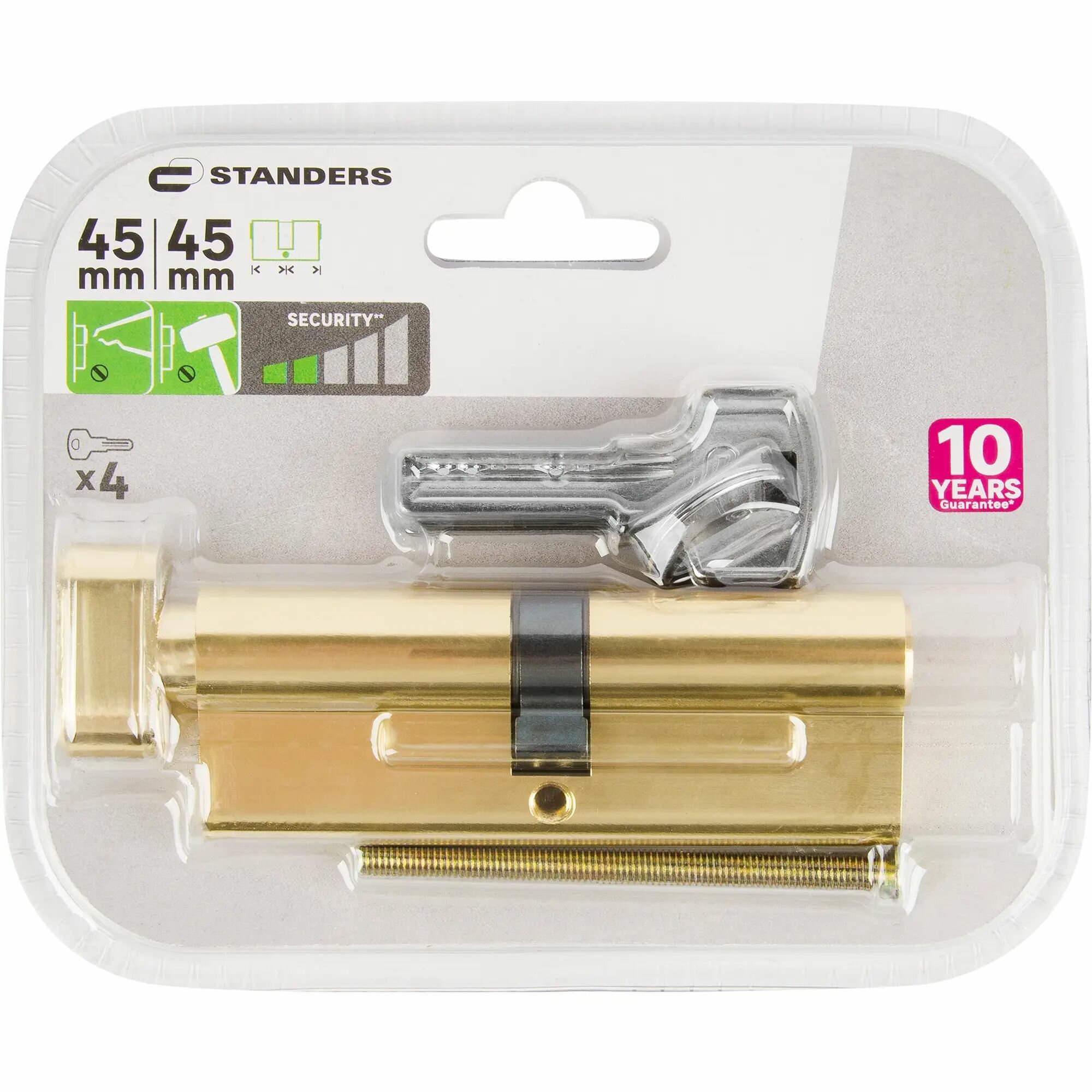 **Цилиндр Standers TTAL1-4545NBGD** предназначен для установки в дверях жилых помещений и общественных учреждений. Материал — алюминий. Покрытие изделия глянцевое, золотистого цвета. 4 ключа английского типа изготовлены из стали и поставляются в комплекте с устройством.