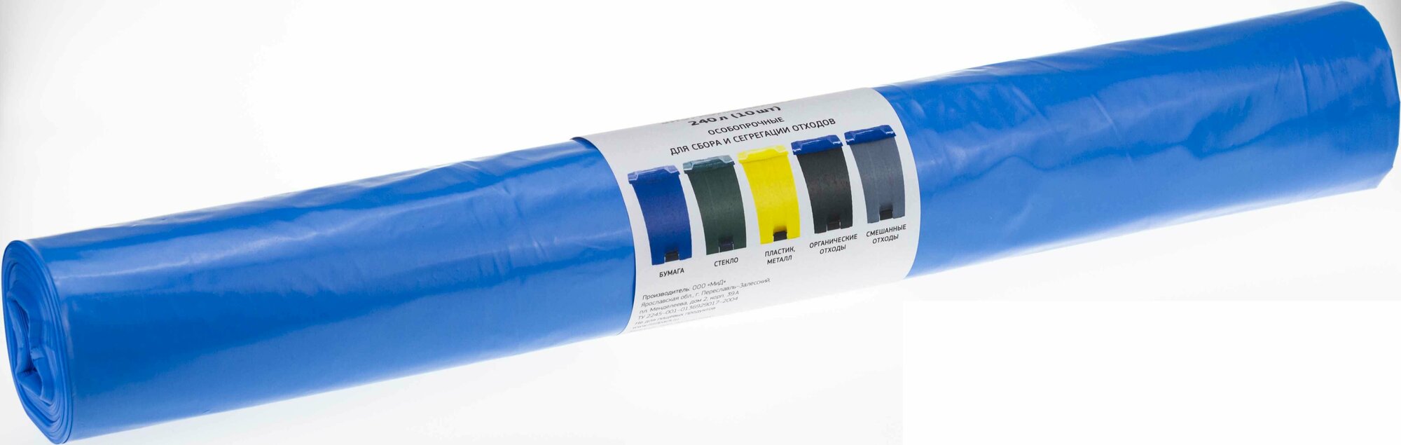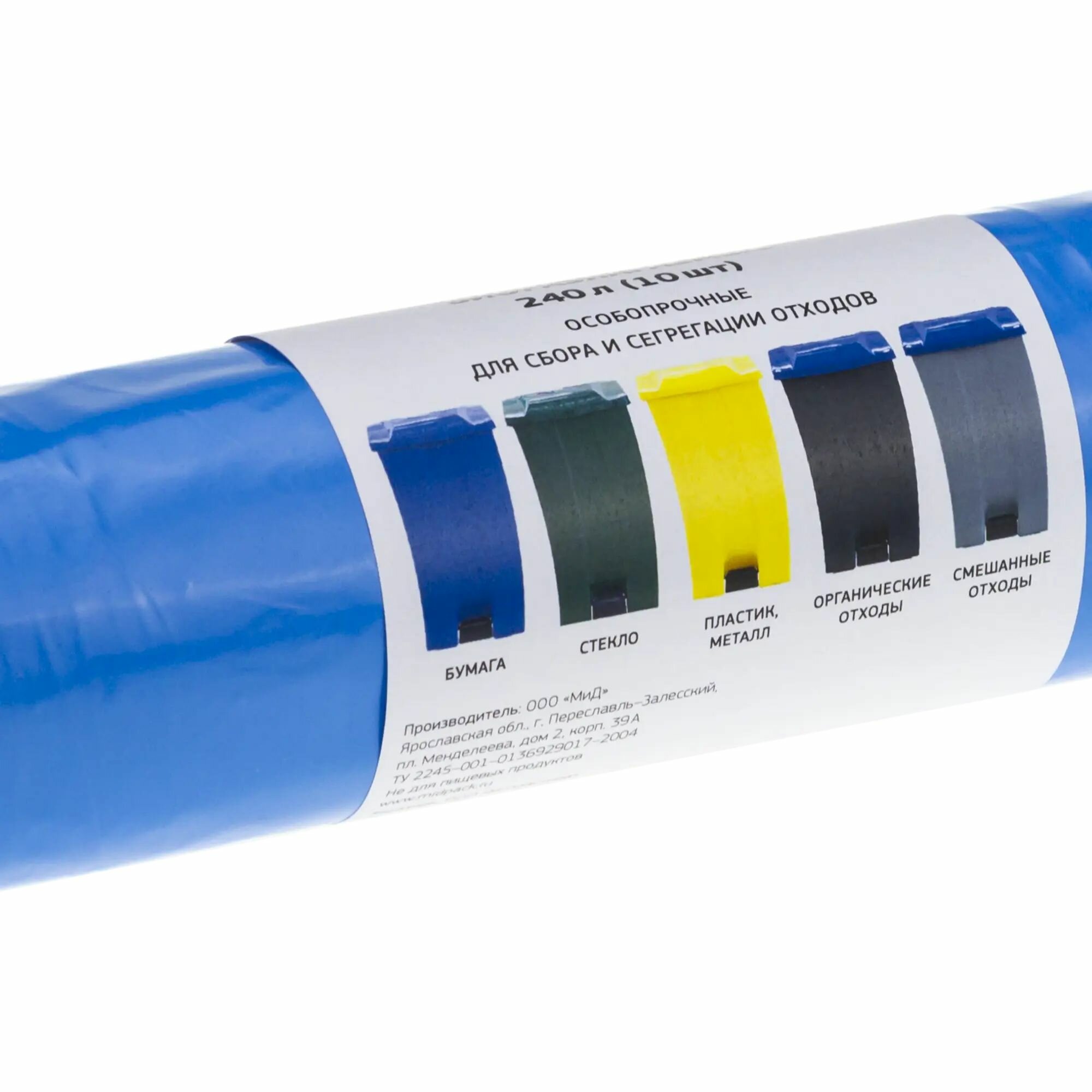 Мешки для мусора — 10 пакетов, свернутых в рулон. Прочные, надежные изделия подходят для утилизации всех видов бытовых отходов. Крупные мешки объемом 240 л имеют высоту 60 см и ширину 60 см. Цвет — синий.