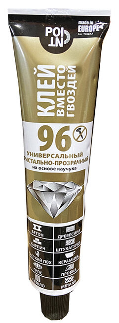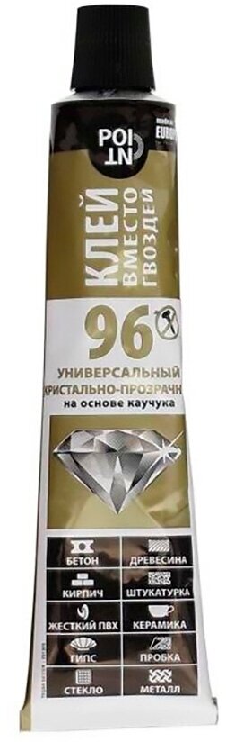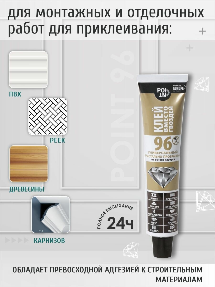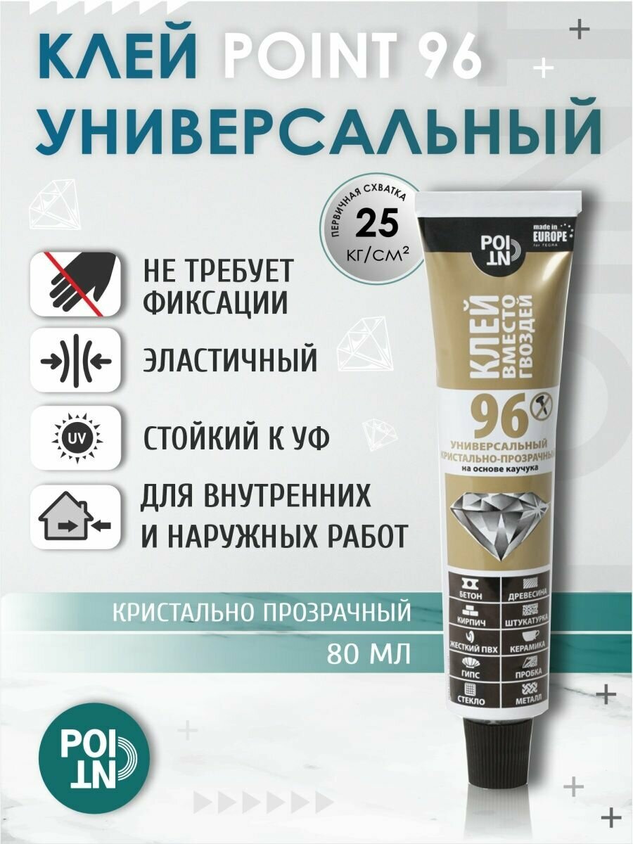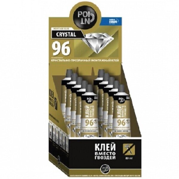 **Клей монтажный Point 96** предназначен для склеивания предметов и деталей из бетона, дерева, кирпича, штукатурки, керамики, гипса, пробки, стекла и металла. Быстро схватывается, не боится влаги и агрессивного воздействия окружающей среды.