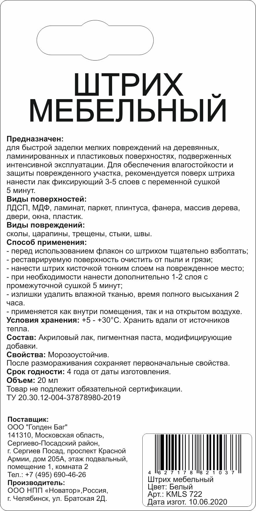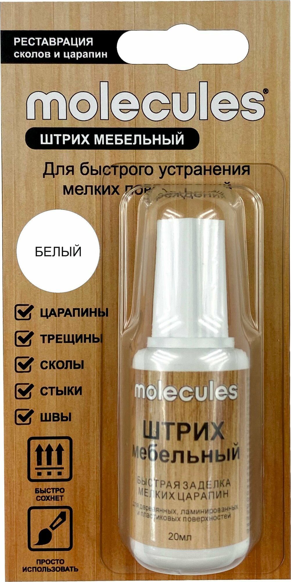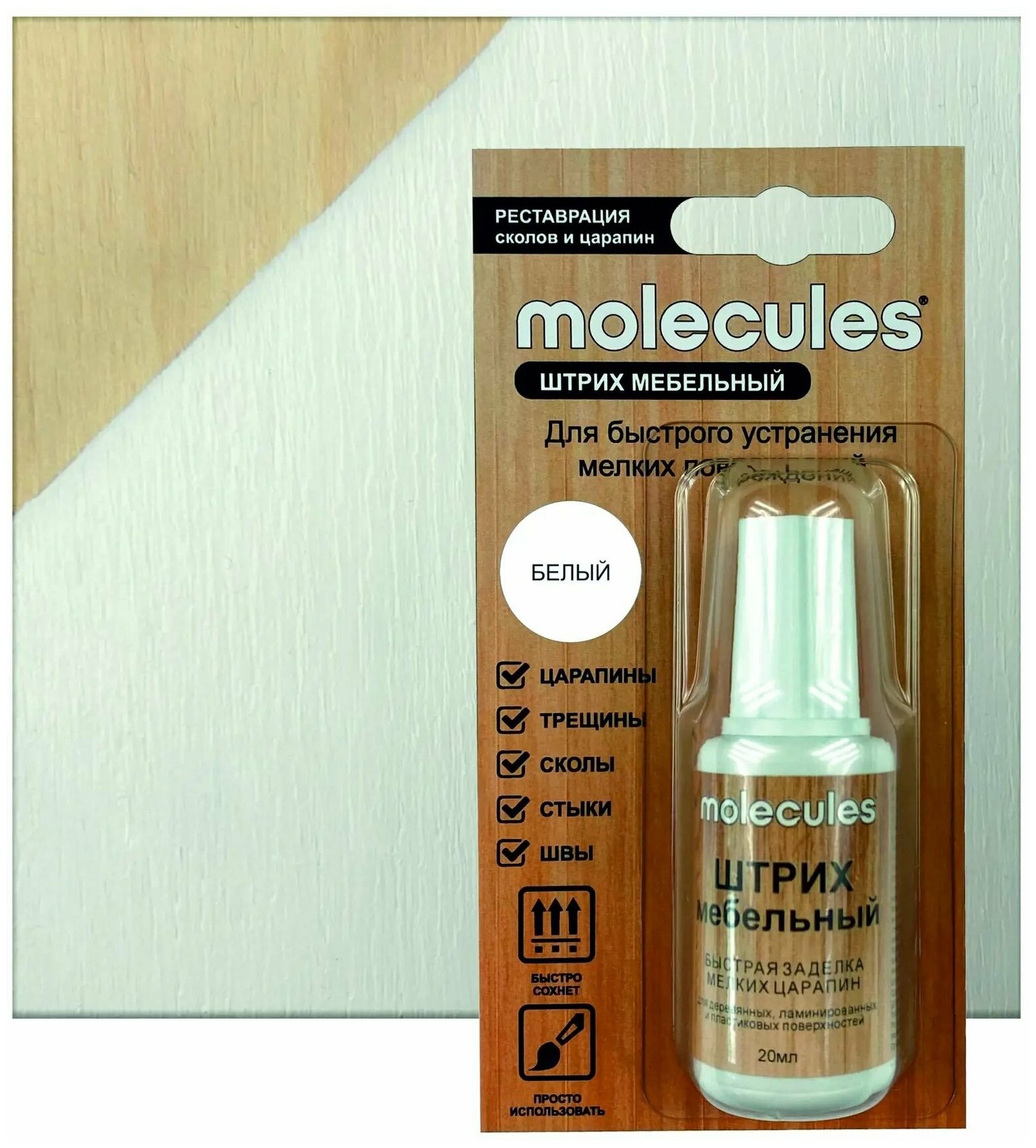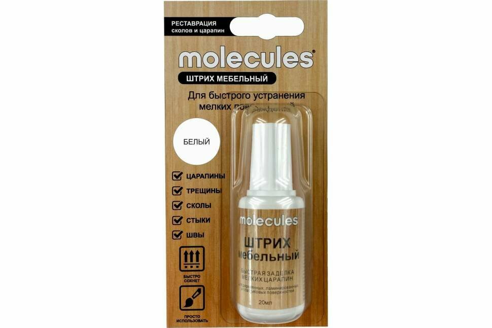 Штрих для реставрации сколов Molecules белого цвета подходит для деревянной или корпусной мебели, поверхностей из МДФ, ДСП, ламинированных полов, паркетной доски. Ретуширующий маркер справляется с царапинами на пластиковых окнах, подоконниках, плинтусах, столешницах, маскирует швы и стыки.