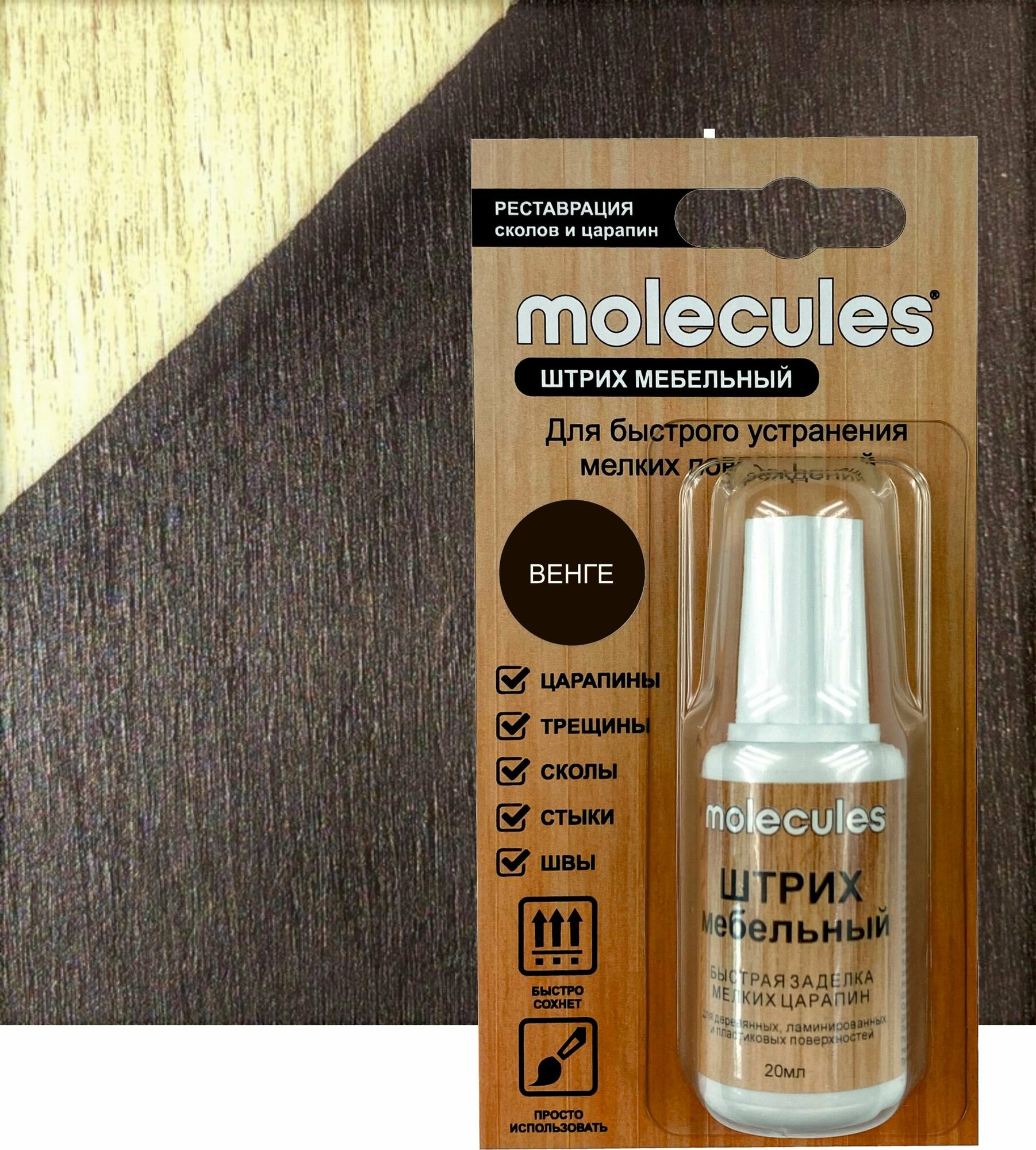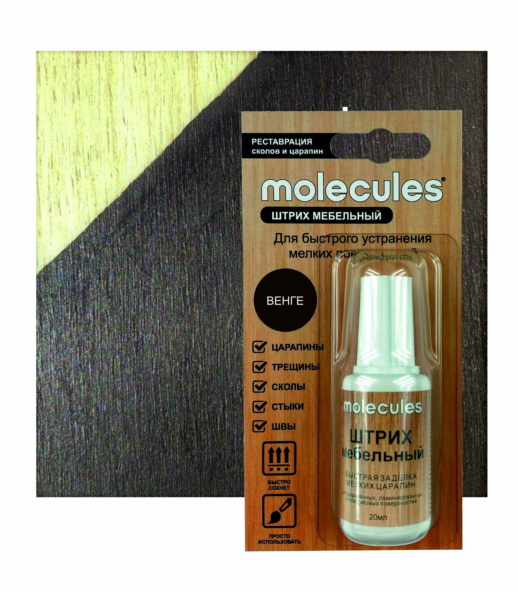 Штрих для реставрации сколов Molecules оттенка «венге» подходит для деревянной или корпусной мебели, поверхностей из МДФ, ДСП, ламинированных полов, паркетной доски. Ретуширующий маркер справляется с царапинами на пластиковых окнах, подоконниках, плинтусах, столешницах, маскирует швы и стыки.