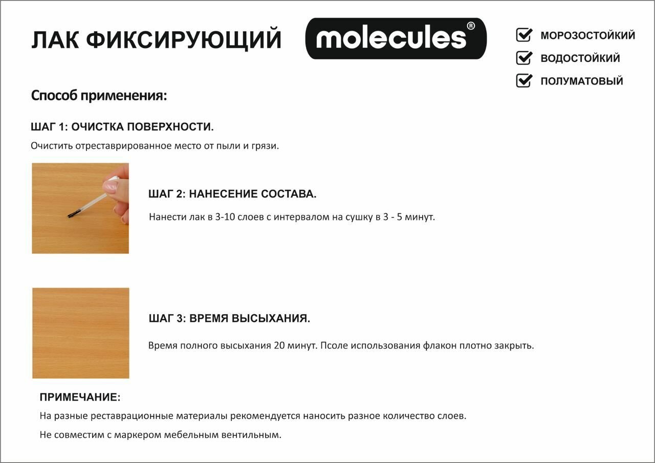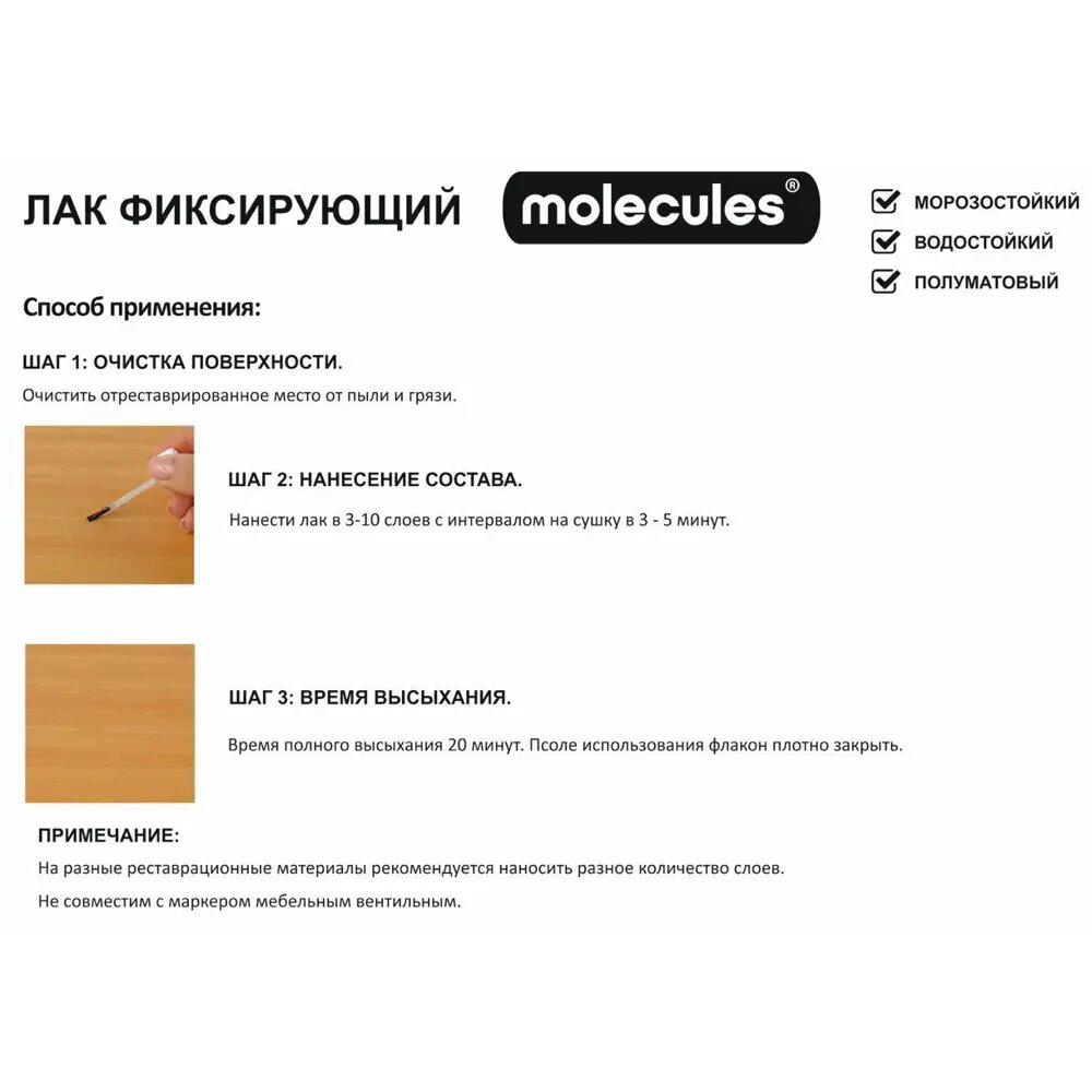 Лак фиксирующий Molecules на алкидной основе используется при выполнении реставрационных работ, предназначен для закрепления ранее нанесенных на поверхность лакокрасочных составов. Готовое прозрачное полуматовое покрытие быстро сохнет и не изменяет декоративные свойства основного материала.