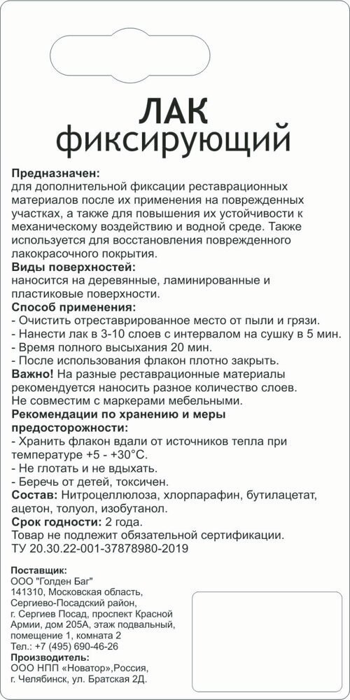Лак используется только внутри помещений. Нанесение на поверхность производится кистью в три слоя. Объем упаковки — 20 мл. Срок годности — 24 месяца. Страна производства — Россия.