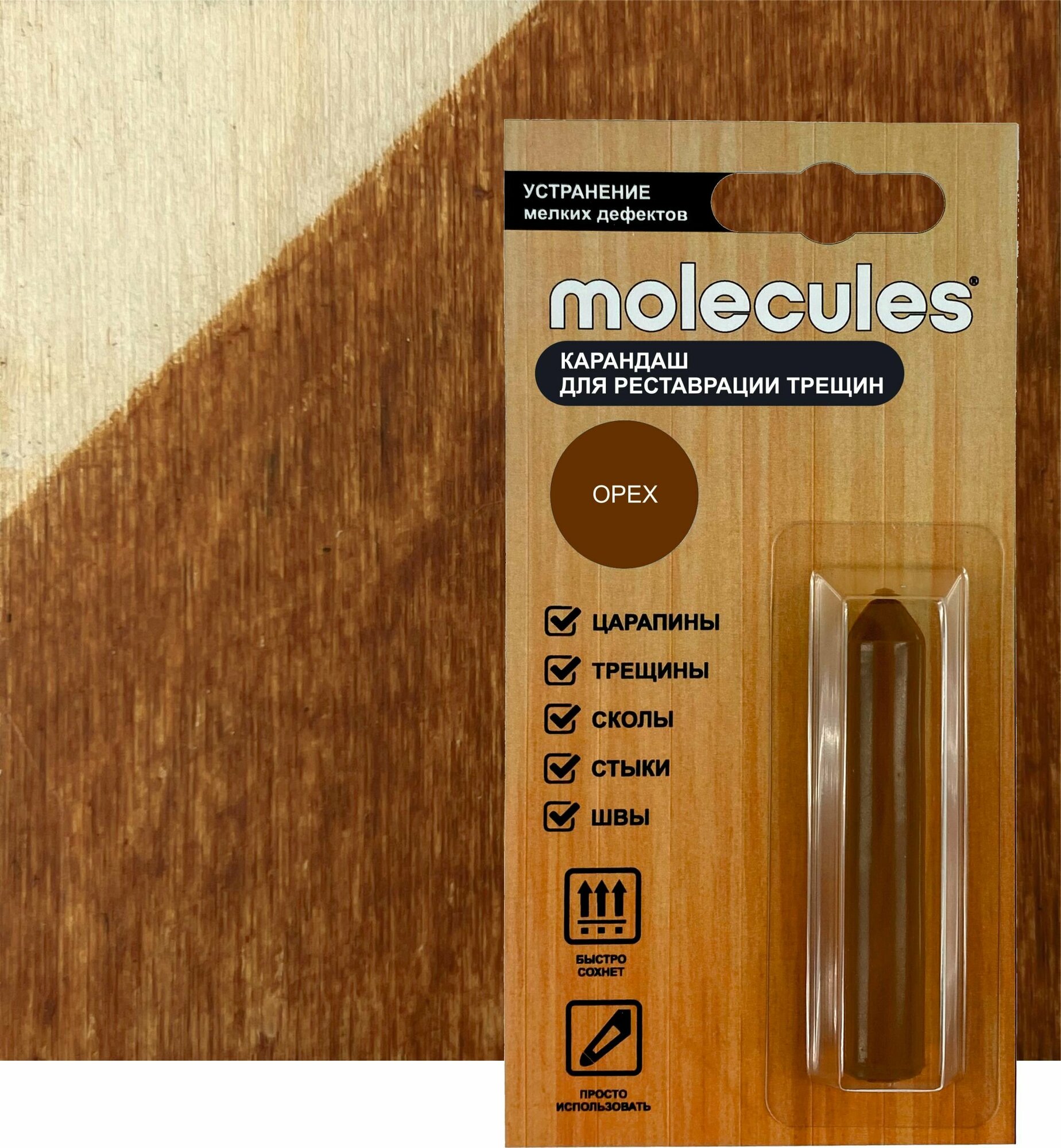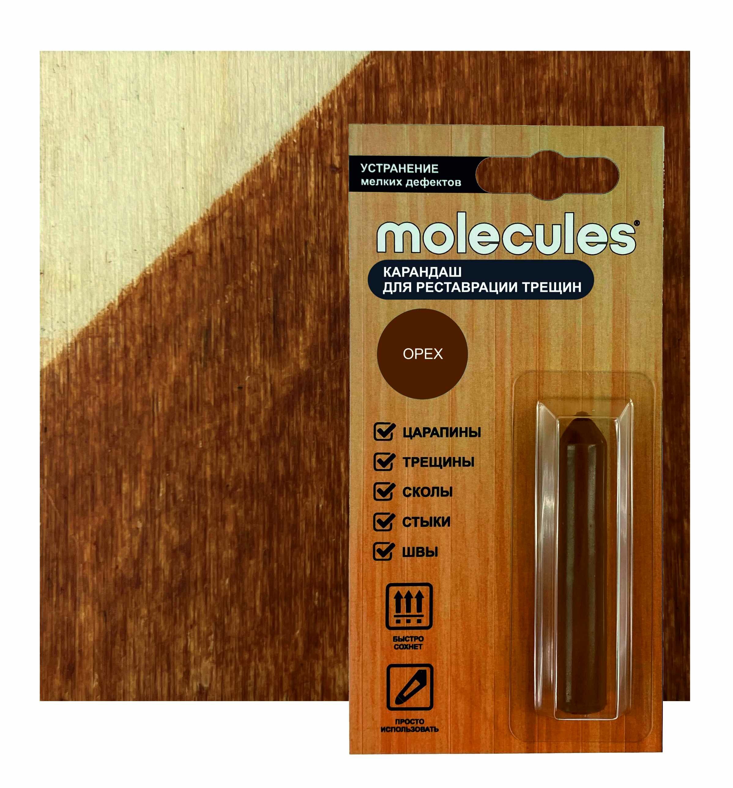 Карандаш для реставрации трещин Molecules оттенка «орех» предназначен для быстрой маскировки небольших повреждений, царапин, стыков, сколов на деревянной мебели, предметах декора, ламинате, паркетной доске, пластике, поверхностях из ДСП, МДФ и фанеры.