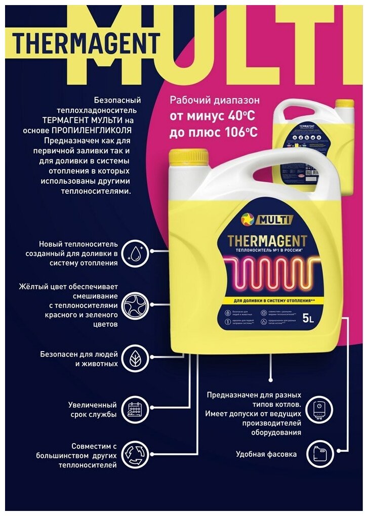 | Способ применения | Предназначен для различных систем отопления и кондиционирования в качестве рабочей жидкости, обеспечивающей работу в диапазоне температур (в соответствии с инструкциями по правилам эксплуатации оборудования). Теплоноситель Thermagent MULTI (-40С ЭКО) разработан специально для доливки в систему отопления, в которой в качестве теплоносителя применен теплоноситель на водно-гликолевой основе. Совместим с большинством видов теплоносителей. Желтый цвет красителя обеспечивает сохранение цвета исходного теплоносителя. Теплоноситель имеет увеличенный срок эксплуатации за счет применения новейшей технологии «Organic Acid Technology». «THERMAGENT MULTI» надежно защищает от коррозионного воздействия черные и цветные металлы. |