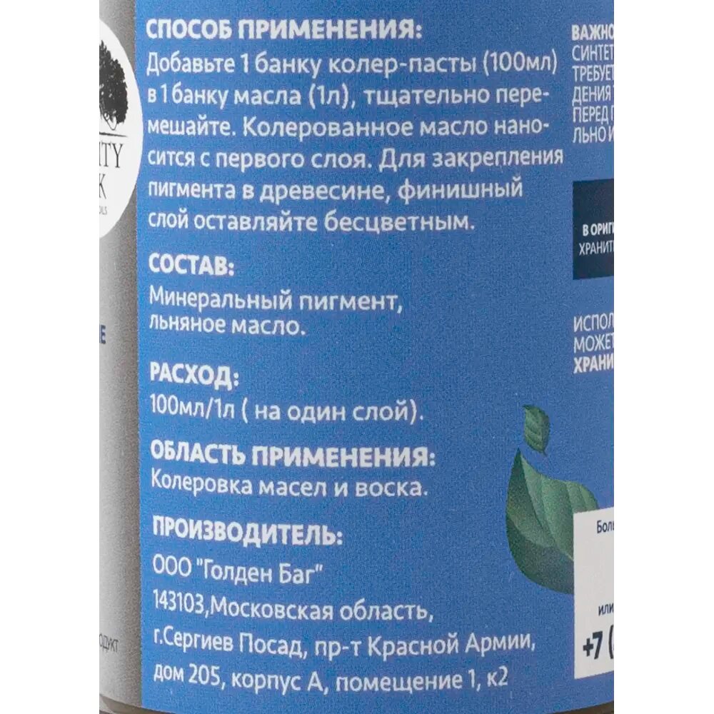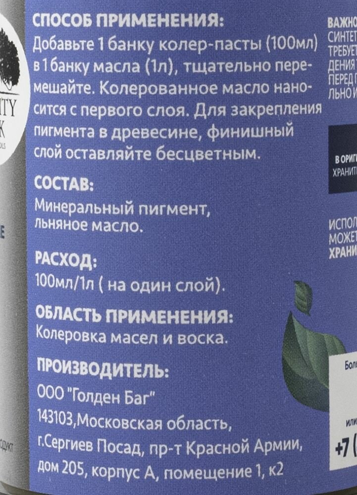 | Инструкция по применению | Добавьте 1 банкуколер-пасты (100мл) в 1 банку масла (1л), тщательно перемешайте. Колерованное масло наносится с первого слоя. Для закрепления пигмента в древесине, финишный слой оставляйте бесцветным |