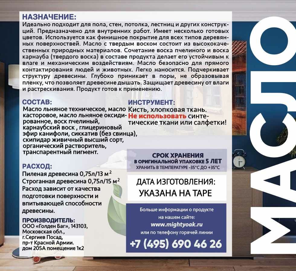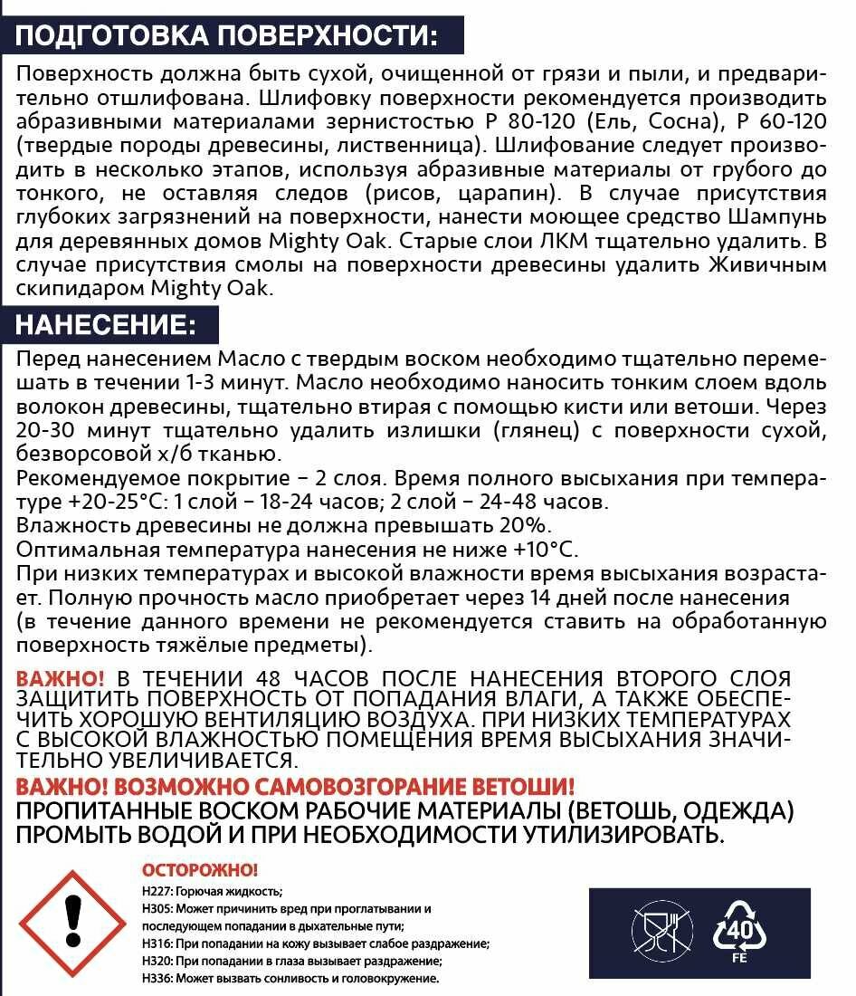 Масло Mighty Oak с твердым воском предназначено для финишного покрытия и защиты деревянных поверхностей. Оберегает материал от воздействия влаги и ультрафиолета, предотвращает рассыхание и растрескивание, подчеркивает натуральный рисунок древесины.