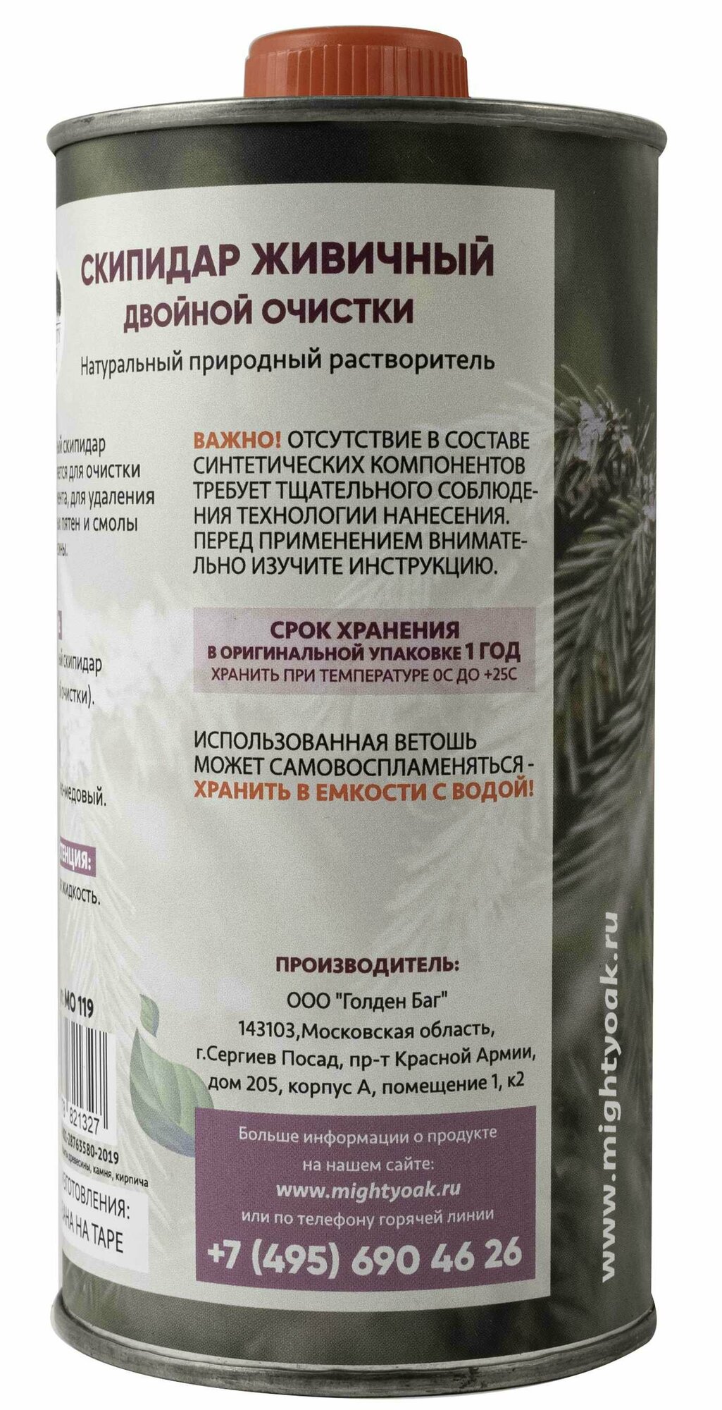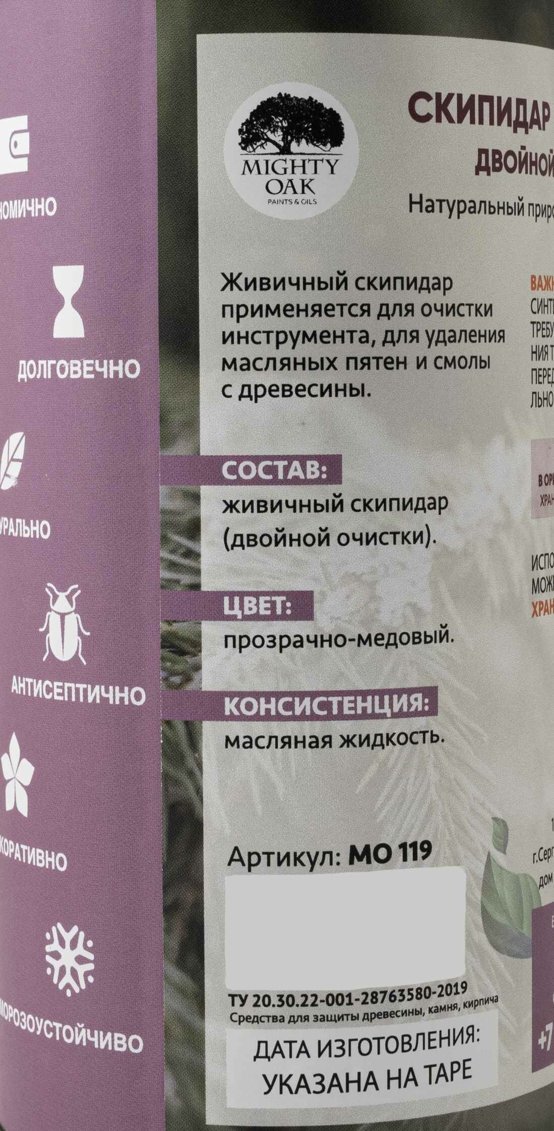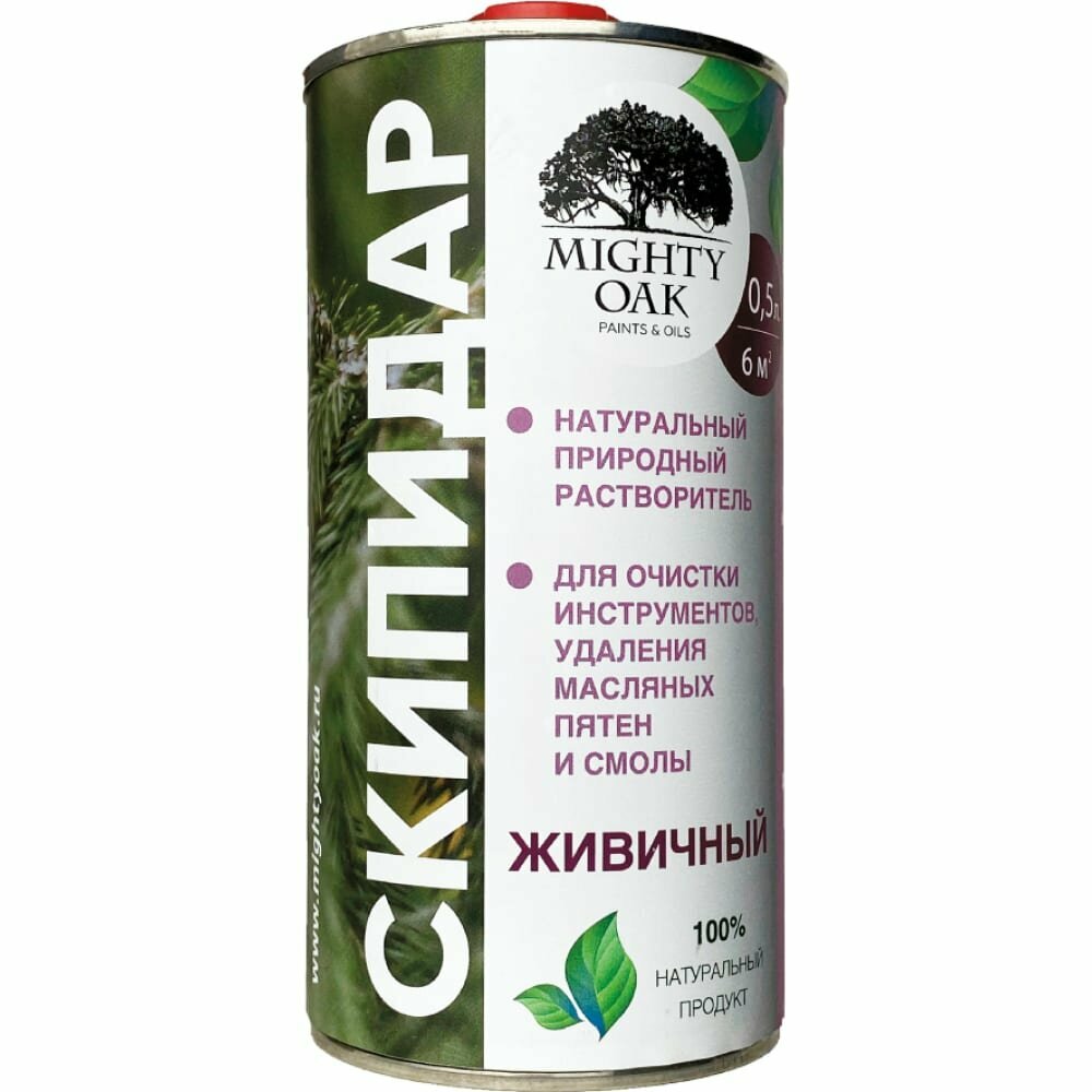 Скипидар живичный Mighty Oak — жидкость с ярким запахом, полученная из смолы деревьев хвойных пород. Применяется в качестве растворителя, для удаления смол с древесины, разбавления масел, ухода за инструментом. Пожароопасен, должен храниться в хорошо закрытой таре, в защищенном от влаги и прямых солнечных лучей помещении.