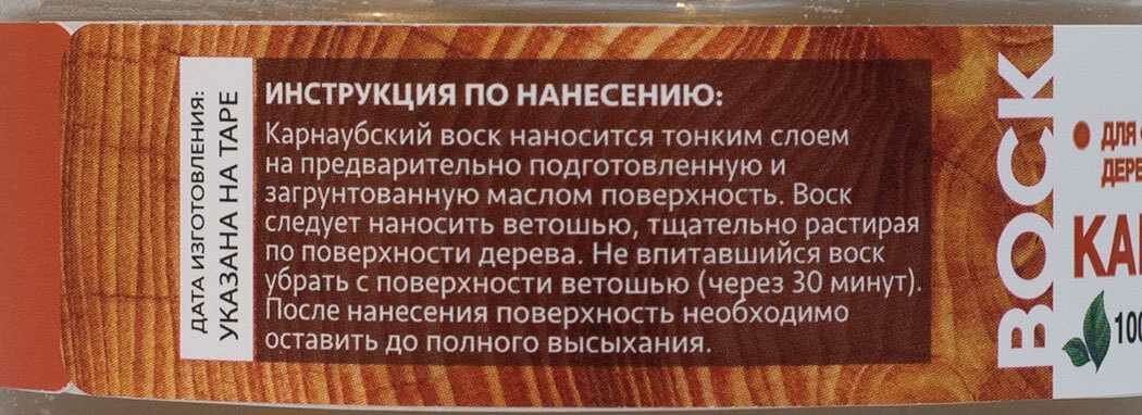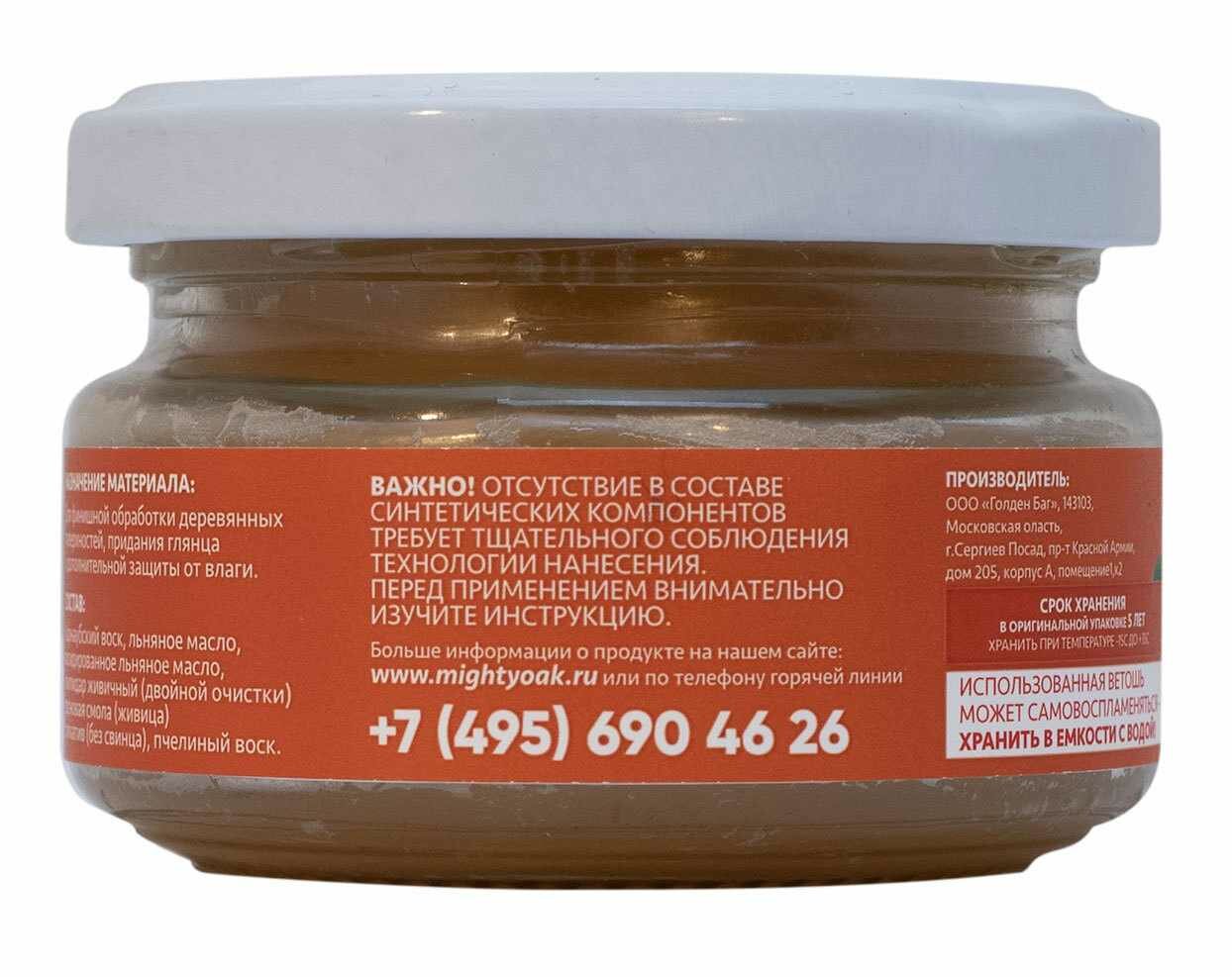 | Состав | Льняное масло, карнаубский воск, сосновая смола (живица), пчелиный воск, скипидар живичный (двойной очистки), сиккатив (без свинца) |