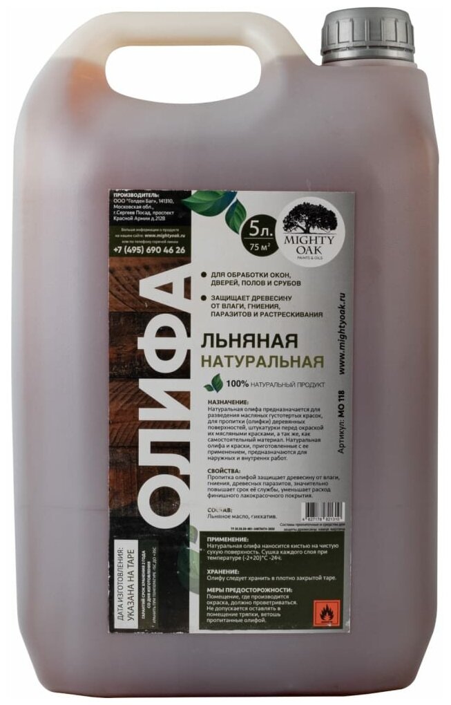 Олифа льняная Mighty Oak — состав на основе натурального масла, предназначенный для обработки и пропитки деревянных поверхностей. Экологически чистый природный антисептик, защищающий дерево от влажности, гниения, грибка, плесени, насекомых и растрескивания. Объем — 5 л.