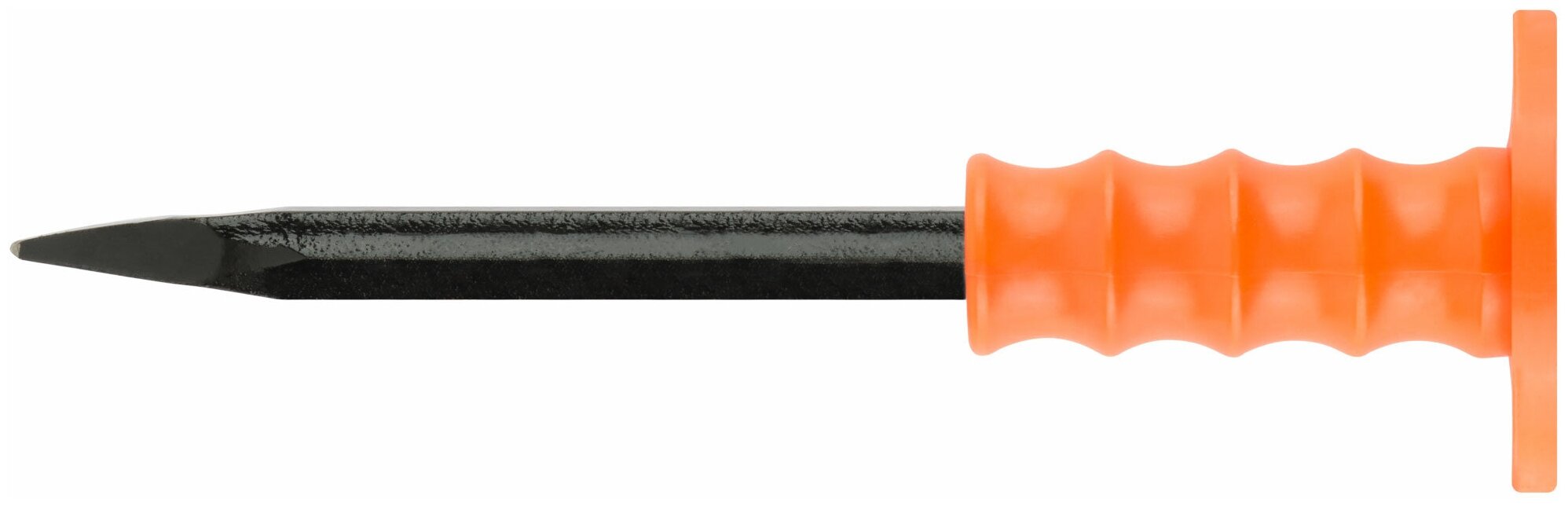 **Зубило с пластиковым протектором** поможет в работе с твердыми материалами, например, камнем, кирпичом, металлом. С его помощью не составит труда отбить нужный кусок от заготовки, придав ей необходимую форму. Рукоять на конце имеет формовку под анатомический хват для удобства и безопасности использования.