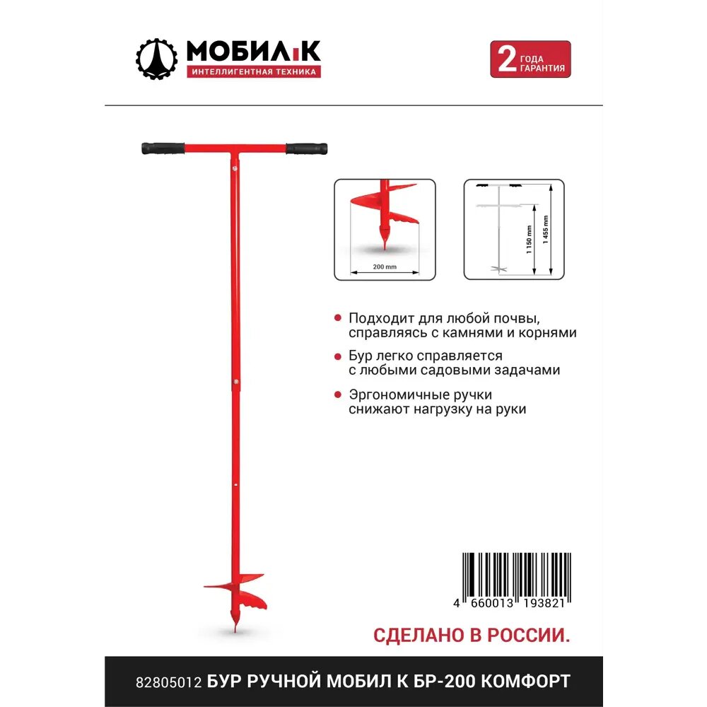 **Бур ручной Мобил К БР-200 Комфорт** позволяет быстро подготовить лунки под посадки, ямы для крепления забора и для других нужд, в том числе в твердой почве. Справляется с глинистой почвой. Диаметр бура 20 см.