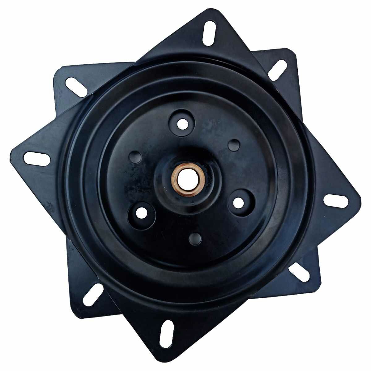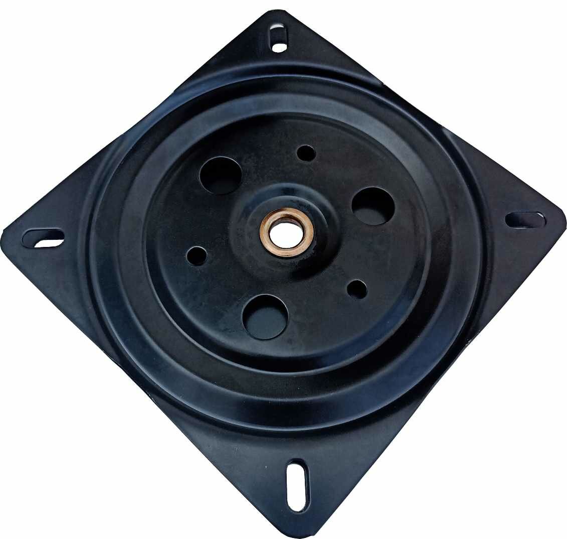 **Поворотное устройство для ТВ-тумбы** используется в качестве подставки под мебель, которая позволяет быстро развернуть телевизор в нужную сторону. Стальной кронштейн рассчитан на бытовую технику весом не более 30 кг. Изделие предназначено для телевизоров, диагональ которых варьируется в диапазоне от 10 до 33 дюймов. Конструкция поворотного устройства состоит из двух пластин — в каждой предусмотрены отверстия, отличающиеся по форме и диаметру. Такая особенность упрощает процесс монтажа кронштейна. Поворот телевизор обеспечивается за счет прокручивания верхней пластины.