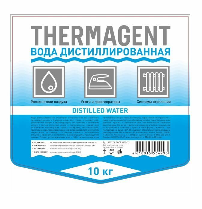 **Вода дистиллированная Thermagent** — универсальный и доступный теплоноситель, который отличается высокими показателями тепловой емкости. Вода, прошедшая процесс дистилляции, не содержит тяжелых металлов и вредных частиц, поэтому не образует на внутренней стороне системы отопления слой накипи и осадок. Использование дистиллированной воды как теплоносителя гарантирует бережное отношение к дорогостоящей отопительной системе.