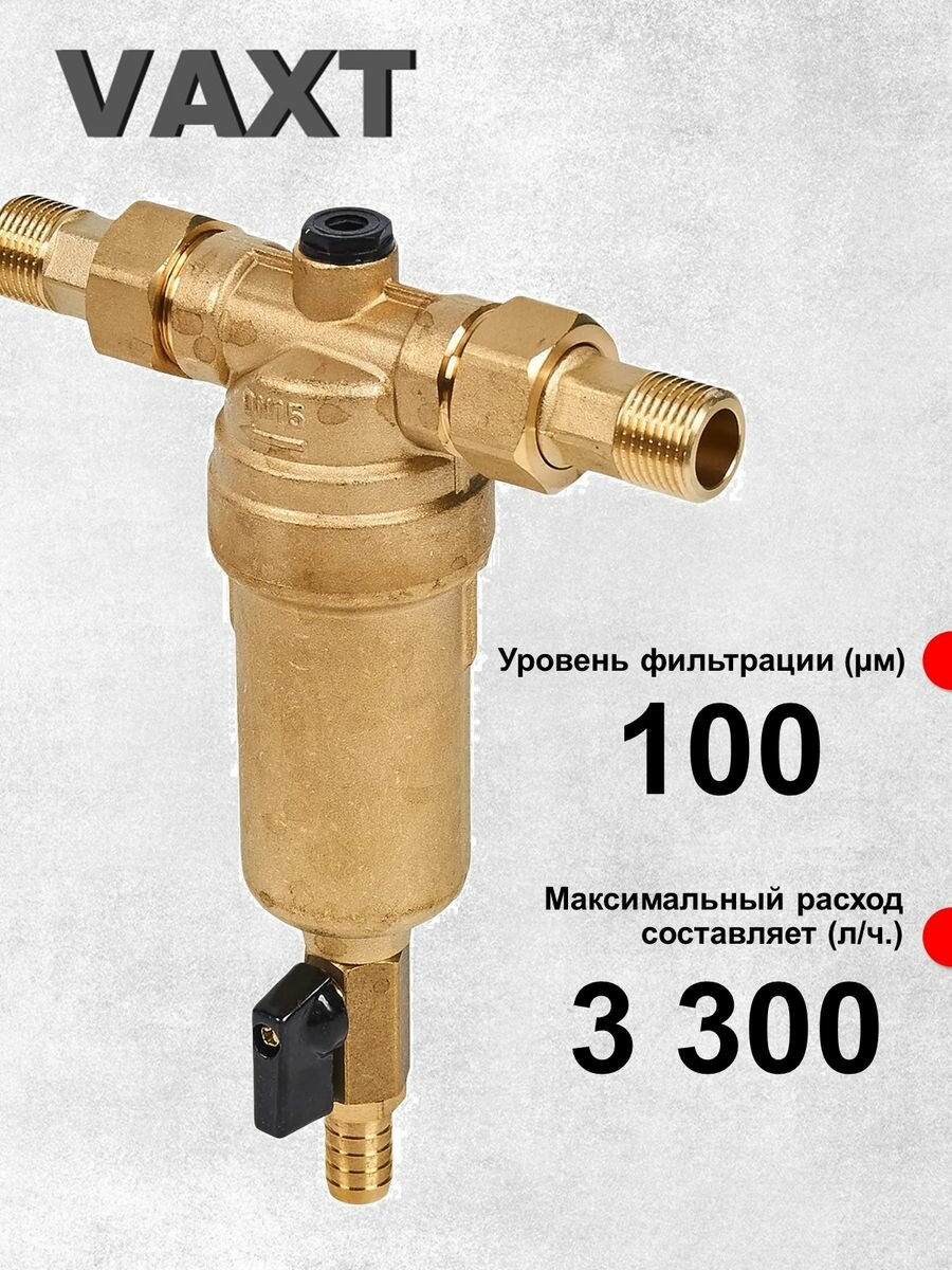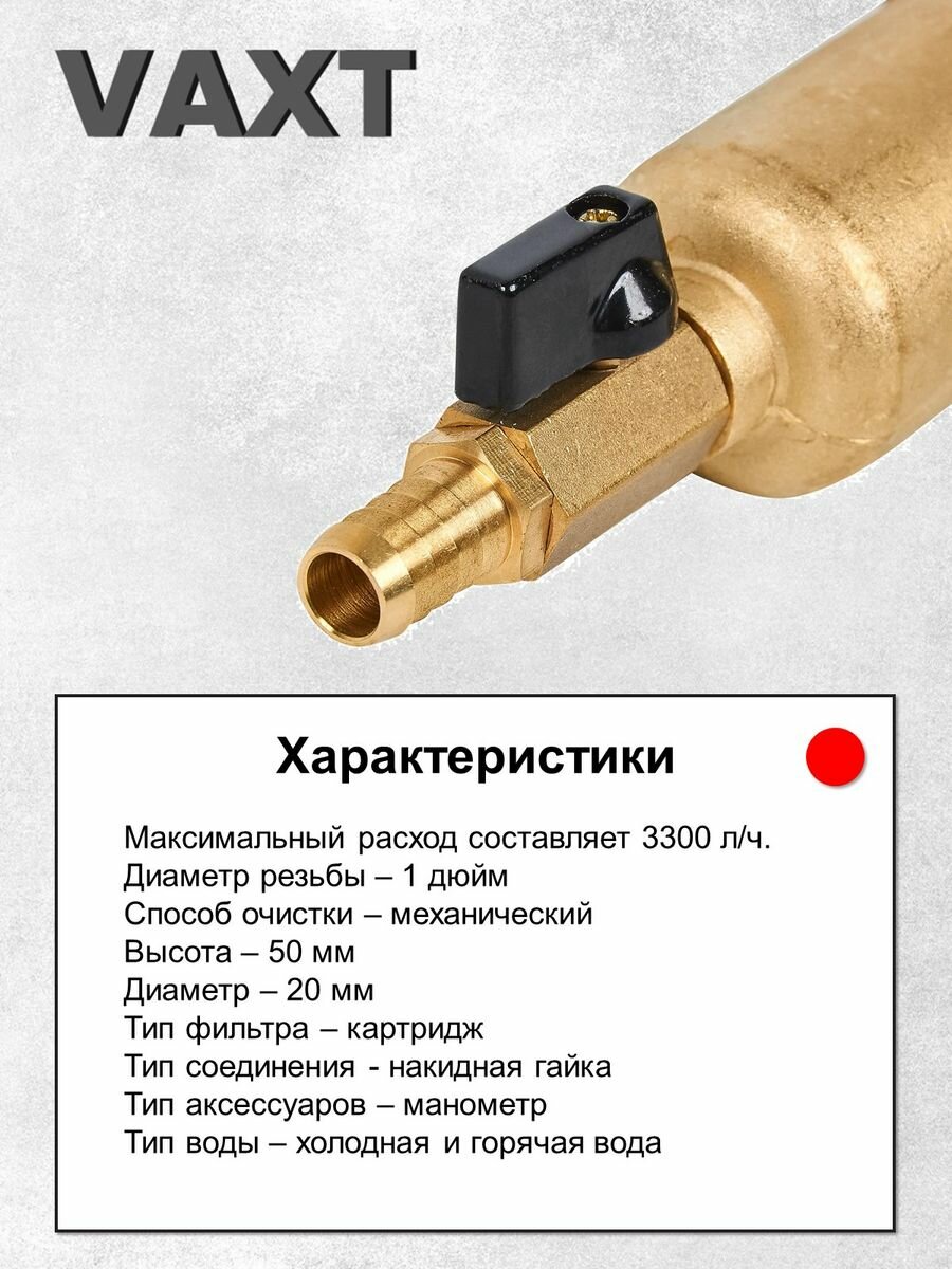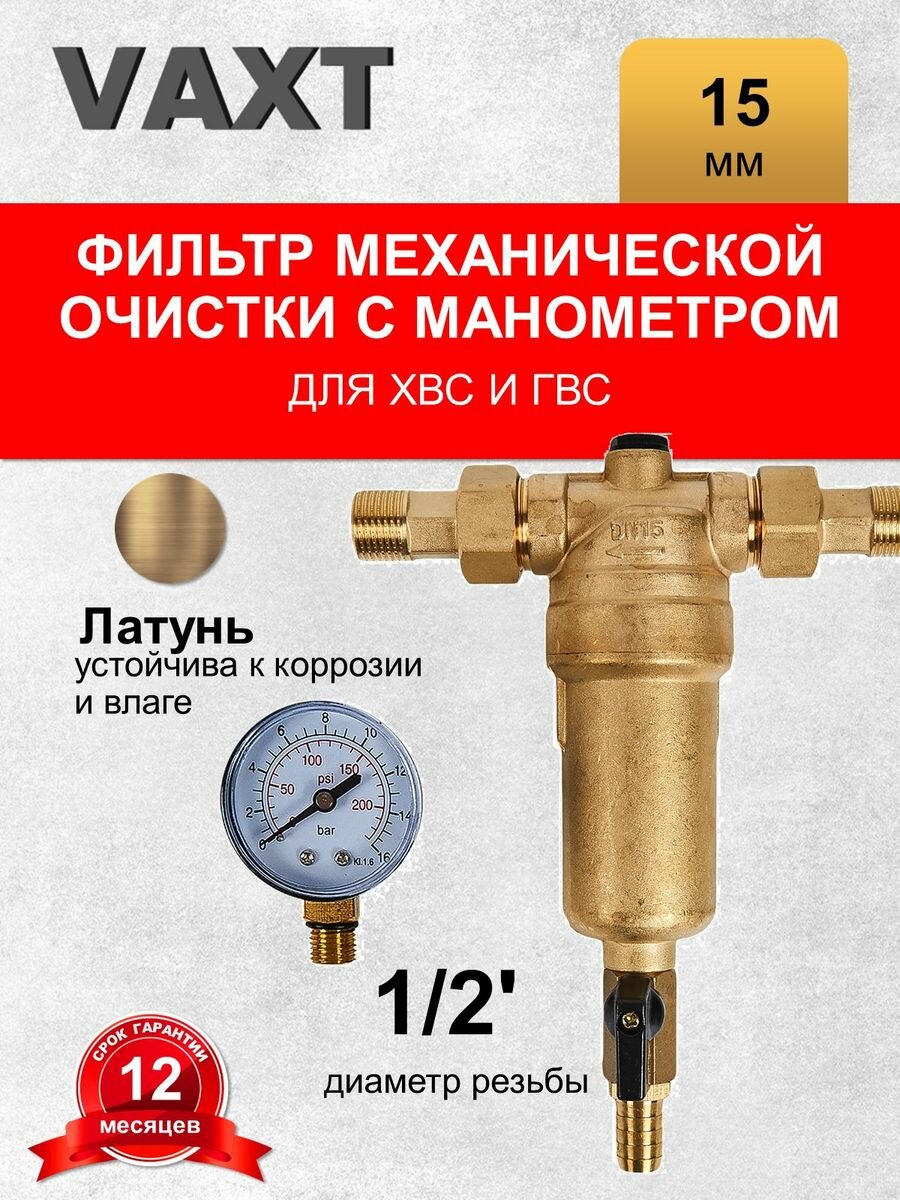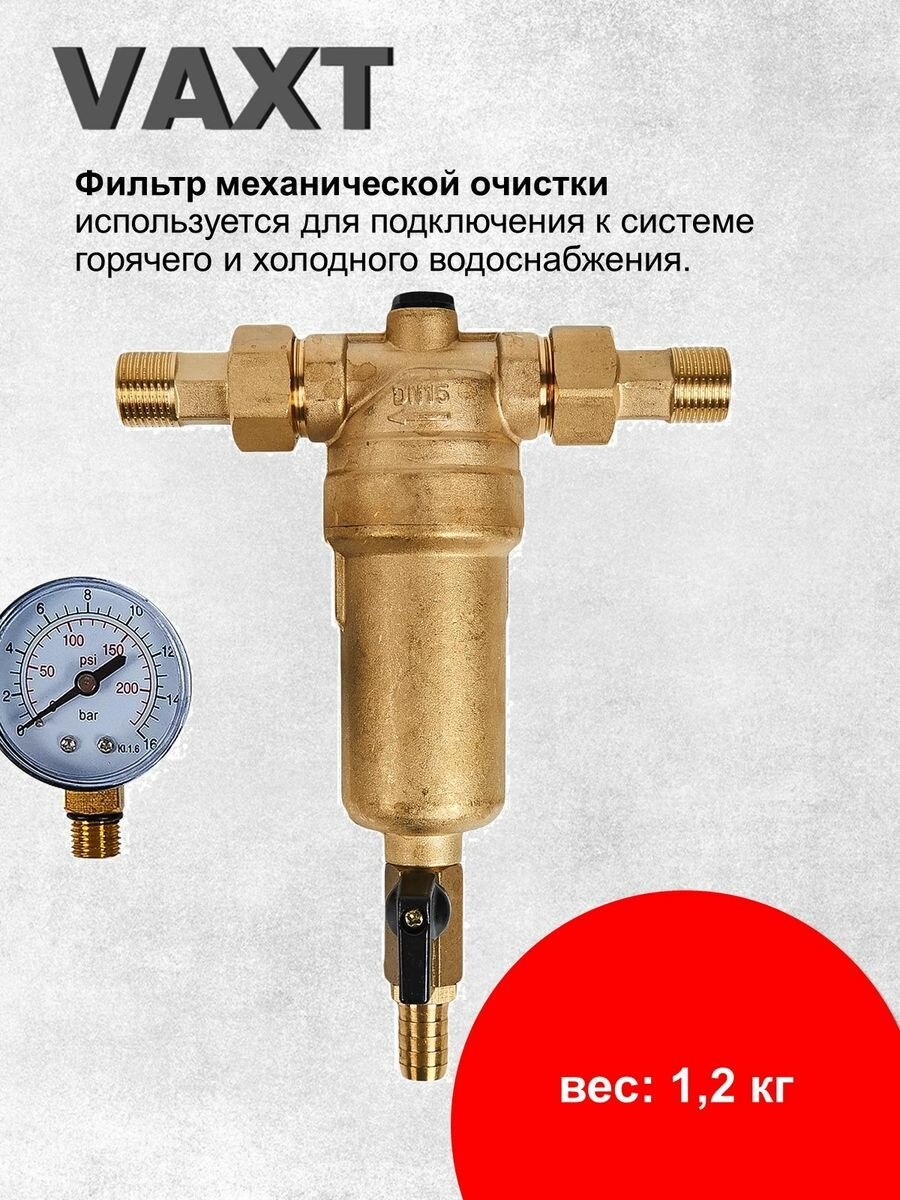 **Фильтр механической очистки** используется для подключения к системе горячего водоснабжения. Изготовлен из латуни, устойчивой к коррозии и влаге. Оснащен манометром. Максимальный расход составляет 3300 л/ч.