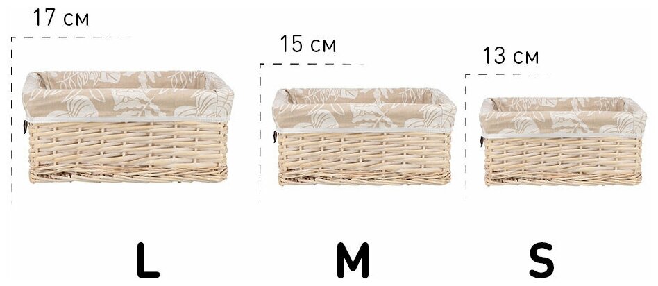 Корзина стеллажная «Листья» EW-92LM-M имеет воздухопроницаемый жесткий каркас из ивовых прутьев и съемный чехол. Универсальный бежевый цвет материалов подчеркивает экологичный стиль изделия. При компактных размерах 340 × 250 × 150 мм и объеме 12,75 л корзина выдерживает нагрузку до 3,5 кг. Прямоугольная форма и отсутствие ручек позволяют составить корзины на стеллажи без потери места.
