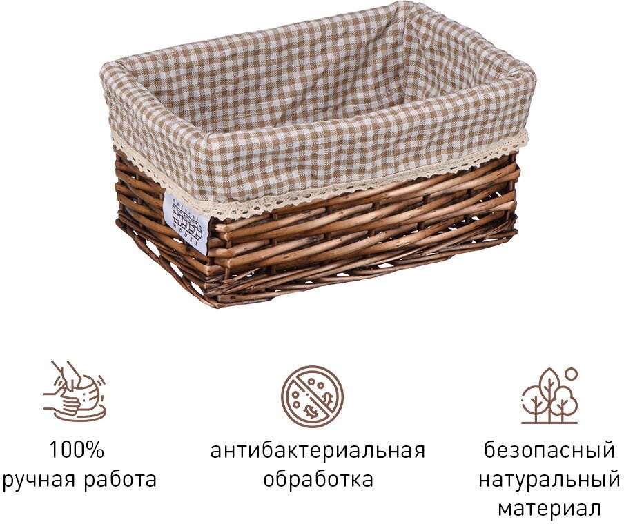 Корзина стеллажная «Плетенка» EW-91LM-M имеет воздухопроницаемый жесткий каркас из ивовых прутьев и съемный чехол. Универсальный коричневый цвет материалов подчеркивает экологичный стиль изделия. При компактных размерах 340 × 250 × 150 мм и объеме 12,75 л корзина выдерживает нагрузку до 3,5 кг. Прямоугольная форма и отсутствие ручек позволяют составить корзины на стеллажи без потери места.